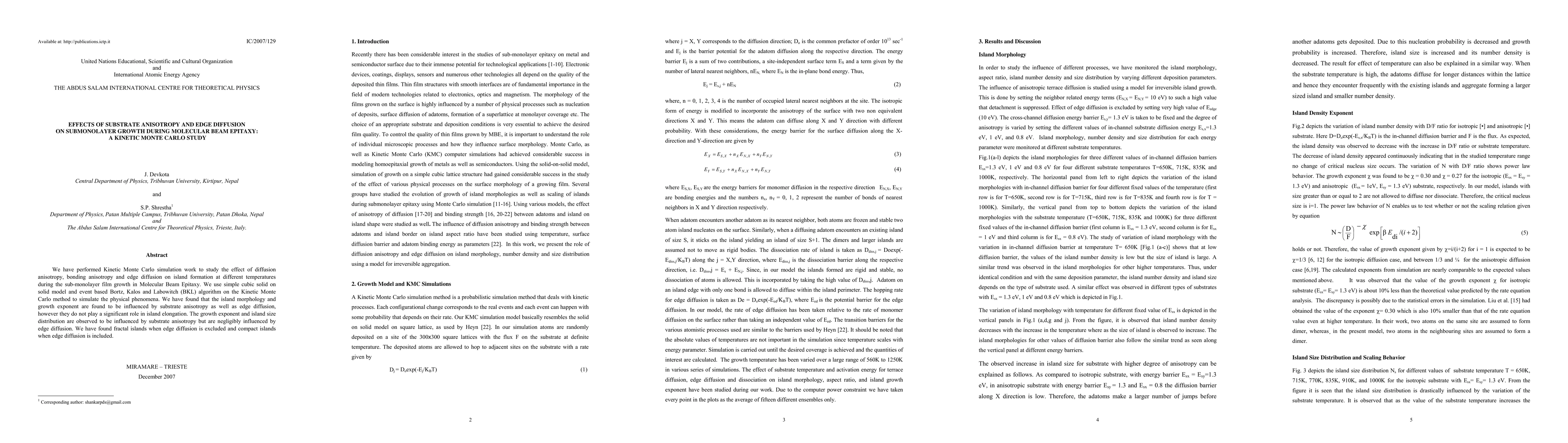 We have performed Kinetic Monte Carlo simulation work to study the effect of diffusion anisotropy, bonding anisotropy and edge diffusion on island formation at different temperatures during the sub-monolayer film growth in Molecular Beam Epitaxy. We use simple cubic solid on solid model and event based Bortz, Kalos and Labowitch (BKL) algorithm on the Kinetic Monte Carlo method to simulate the physical phenomena. We have found that the island morphology and growth exponent are found to be influenced by substrate anisotropy as well as edge diffusion, however they do not play a significant role in island elongation. The growth exponent and island size distribution are observed to be influenced by substrate anisotropy but are negligibly influenced by edge diffusion. We have found fractal islands when edge diffusion is excluded and compact islands when edge diffusion is included.