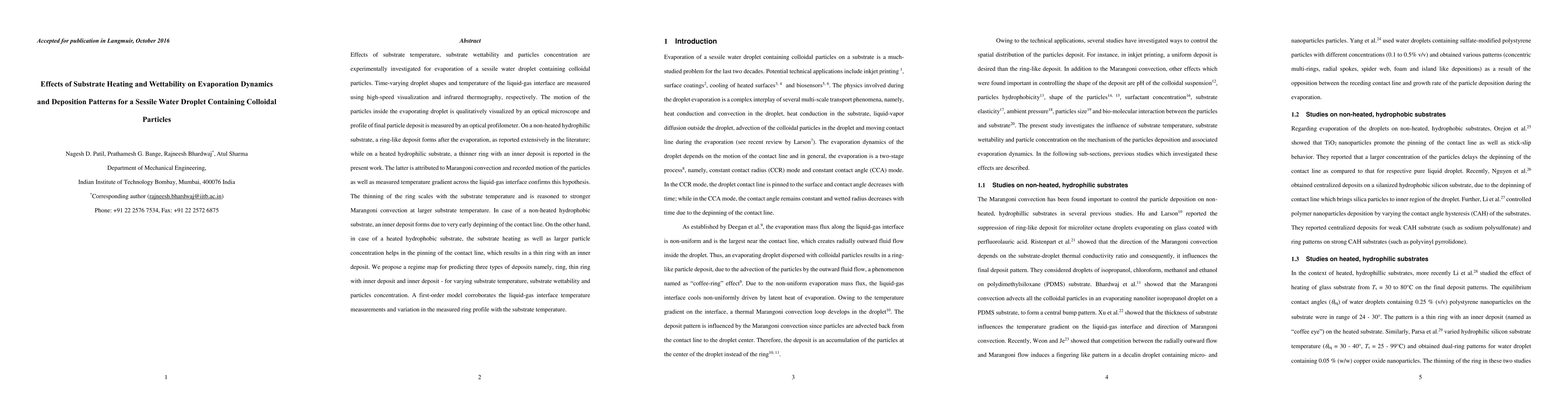 This study experimentally investigates the impact of substrate temperature, wettability, and particle concentration on the evaporation dynamics and deposition patterns of sessile water droplets containing colloidal particles. The findings reveal distinct deposit formations influenced by substrate heating and wettability, proposing a regime map for predicting different deposit types based on these factors.
