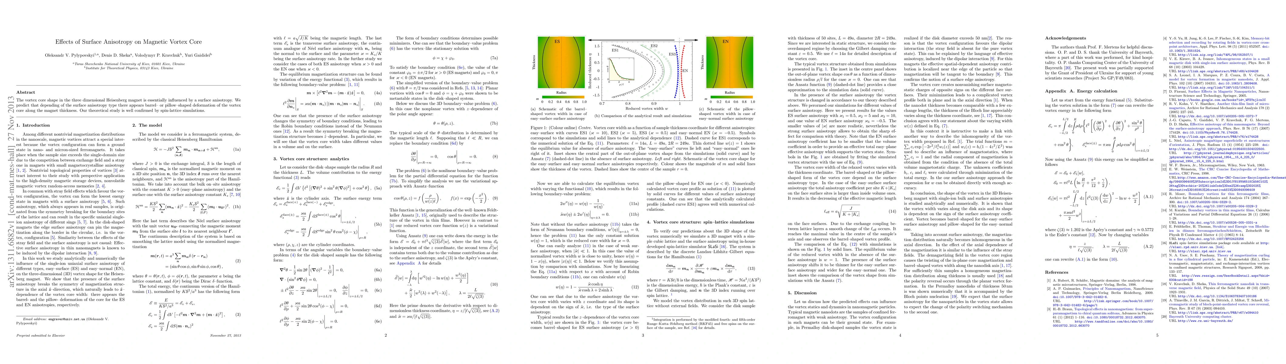 The vortex core shape in the three dimensional Heisenberg magnet is essentially influenced by a surface anisotropy. We predict that depending of the surface anisotropy type there appears barrel- or pillow-shaped deformation of the vortex core along the magnet thickness. Our theoretical study is well confirmed by spin-lattice simulations.