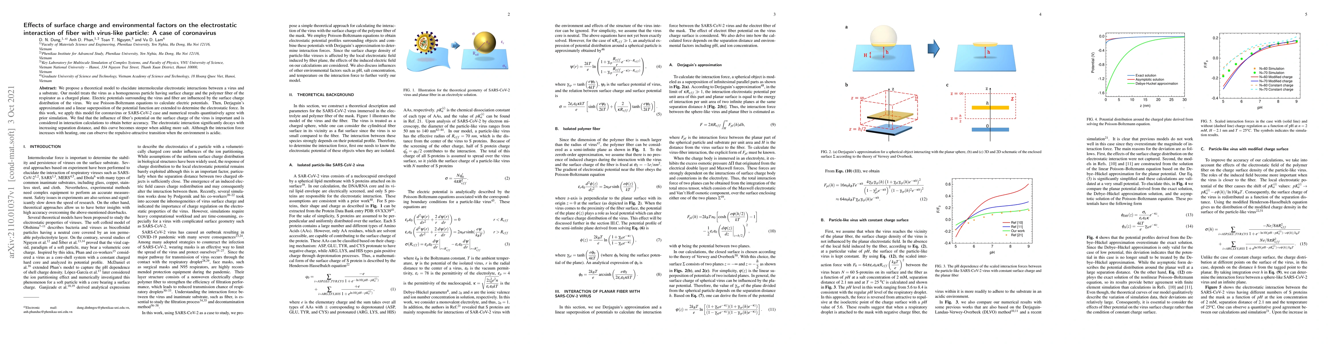 This paper develops a theoretical model to analyze electrostatic interactions between a charged polymer fiber and a virus-like particle, specifically SARS-CoV-2, using Poisson-Boltzmann equations and Derjaguin's approximation. The study finds that surface charge and environmental factors like salt concentration and temperature significantly influence the interaction, with repulsive-attractive transitions under acidic conditions.