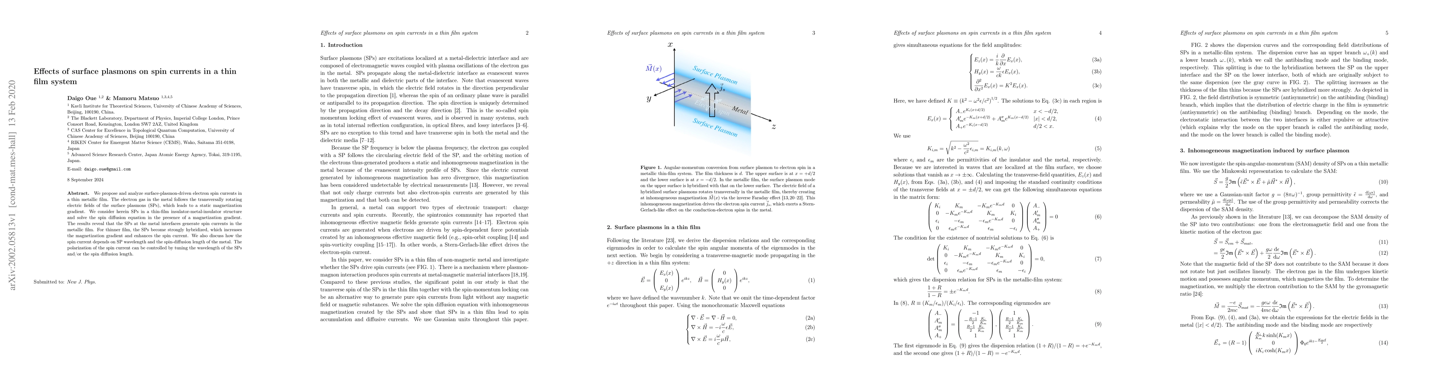 The paper presents a detailed analysis of surface plasmon-driven spin currents in thin metallic films, including the calculation of spin angular momentum density and the derivation of the spin diffusion equation with a magnetization gradient.