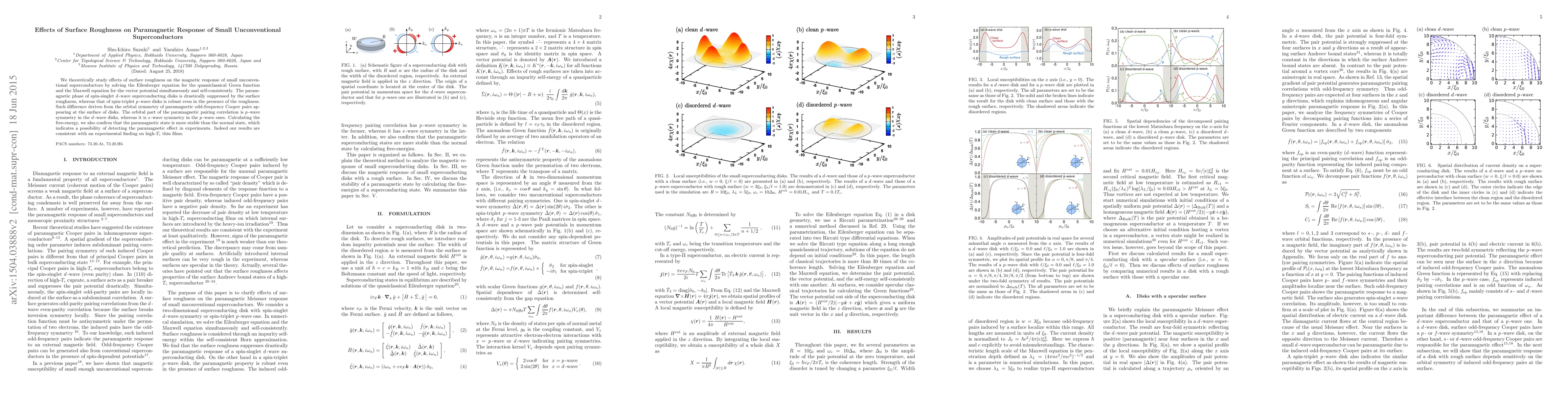 We theoretically study effects of surface roughness on the magnetic response of small unconventional superconductors by solving the Eilenberger equation for the quassiclassical Green function and the Maxwell equation for the vector potential simultaneously and self-consistently. The paramagnetic phase of spin-singlet $d$-wave superconducting disks is drastically suppressed by the surface roughness, whereas that of spin-triplet $p$-wave disks is robust even in the presence of the roughness. Such difference derives from the orbital symmetry of paramagnetic odd-frequency Cooper pairs appearing at the surface of disks. The orbital part of the paramagnetic pairing correlation is $p$-wave symmetry in the $d$-wave disks, whereas it is $s$-wave symmetry in the $p$-wave ones. Calculating the free-energy, we also confirm that the paramagnetic state is more stable than the normal state, which indicates a possibility of detecting the paramagnetic effect in experiments. Indeed our results are consistent with an experimental finding on high-$T_c$ thin films.