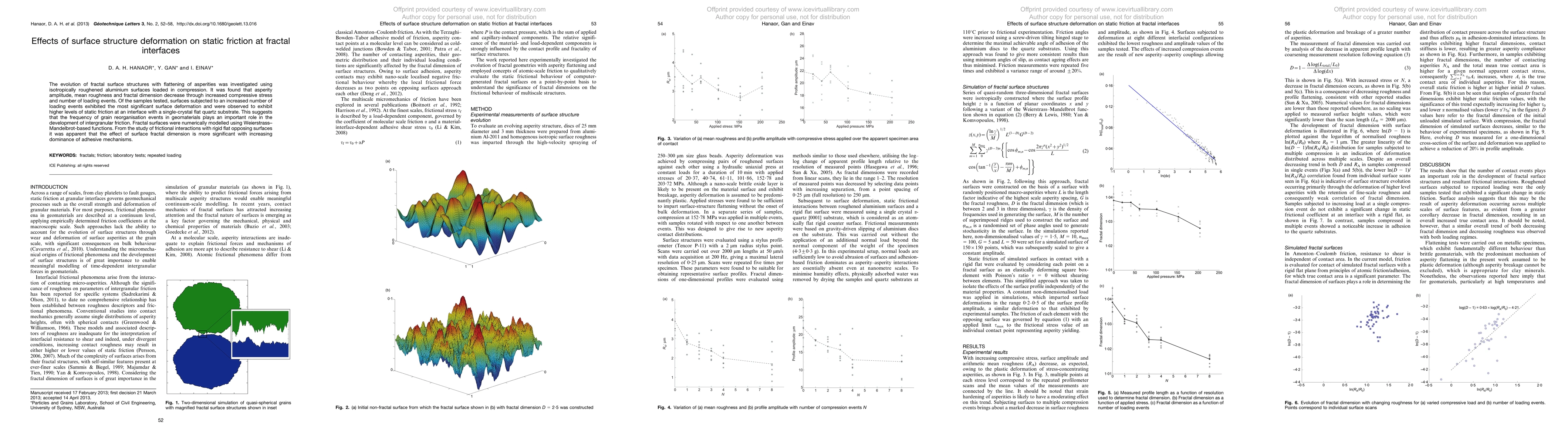 The evolution of fractal surface structures with flattening of asperities was investigated using isotropically roughened aluminium surfaces loaded in compression. It was found that asperity amplitude, mean roughness and fractal dimension decrease through increased compressive stress and number of loading events. Of the samples tested, surfaces subjected to an increased number of loading events exhibited the most significant surface deformation and were observed to exhibit higher levels of static friction at an interface with a single crystal flat quartz substrate. This suggests that the frequency of grain reorganisation events in geomaterials plays an important role in the development of intergranular friction. Fractal surfaces were numerically modelled using Weierstrass- Mandelbrot based functions. From the study of frictional interactions with rigid flat opposing surfaces it was apparent that the effect of surface fractal dimension is more significant with increasing dominance of adhesive mechanisms.