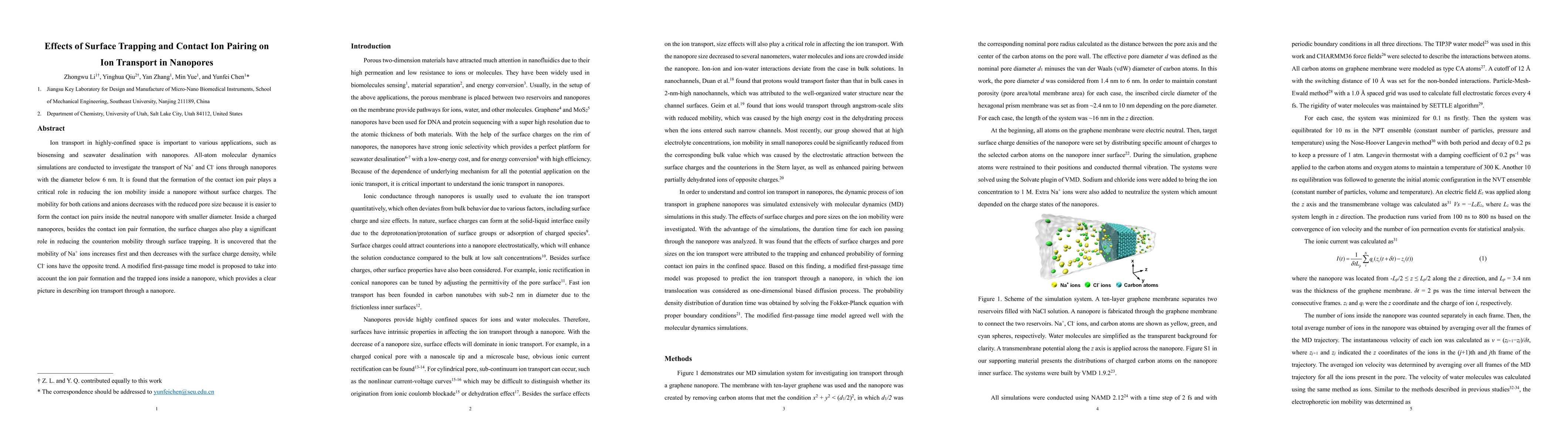 Summary: Molecular dynamics simulations reveal that contact ion pairing significantly reduces ion mobility in neutral nanopores, while surface trapping affects ion transport in charged nanopores. A modified first-passage time model is proposed to better describe ion transport dynamics considering ion pairing and trapping effects.