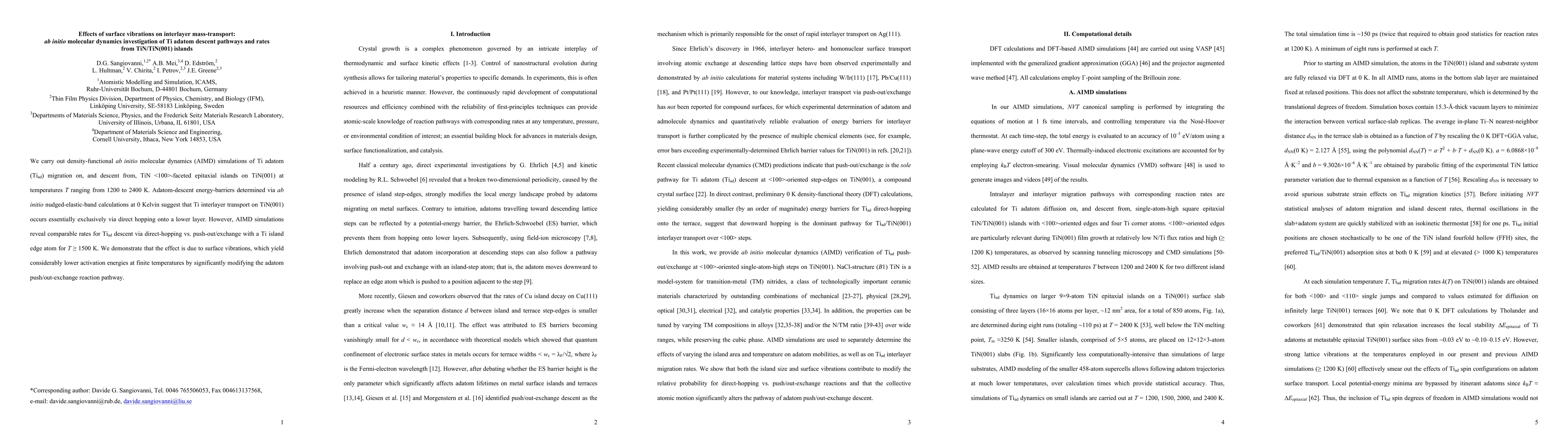 We carry out density-functional ab initio molecular dynamics (AIMD) simulations of Ti adatom (Tiad) migration on, and descent from, TiN <100>-faceted epitaxial islands on TiN(001) at temperatures T ranging from 1200 to 2400 K. Adatom-descent energy-barriers determined via ab initio nudged-elastic-band calculations at 0 Kelvin suggest that Ti interlayer transport on TiN(001) occurs essentially exclusively via direct hopping onto a lower layer. However, AIMD simulations reveal comparable rates for Tiad descent via direct-hopping vs. push-out/exchange with a Ti island edge atom for T >= 1500 K. We demonstrate that the effect is due to surface vibrations, which yield considerably lower activation energies at finite temperatures by significantly modifying the adatom push/out-exchange reaction pathway.