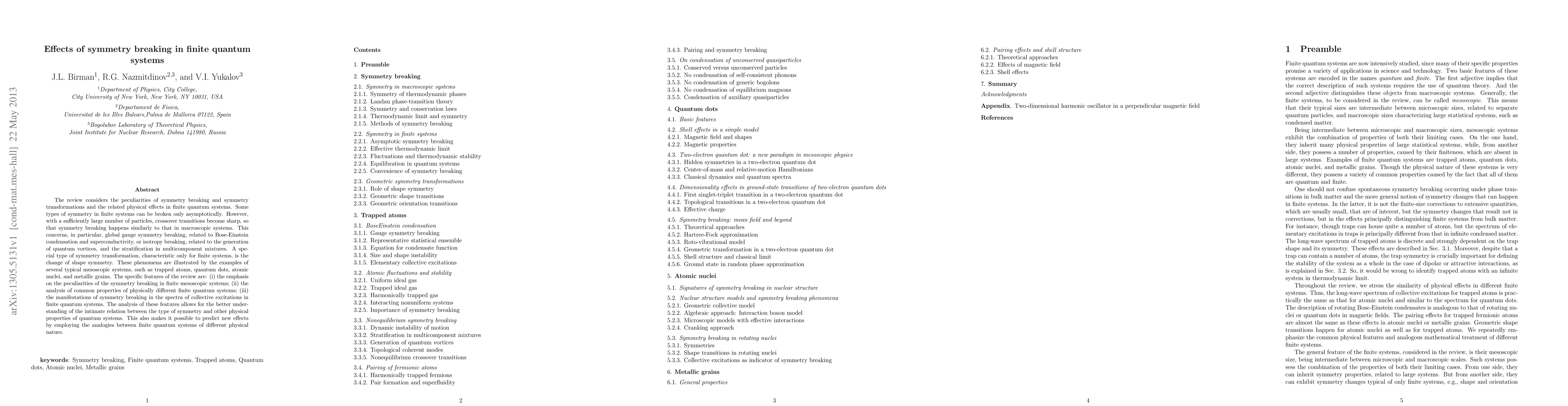 This review examines the unique aspects of symmetry breaking and transformations in finite quantum systems, highlighting how these phenomena manifest in mesoscopic systems like trapped atoms and quantum dots. It emphasizes the crossover from asymptotic to sharp symmetry breaking in large systems and predicts new effects by drawing analogies between different types of finite quantum systems.