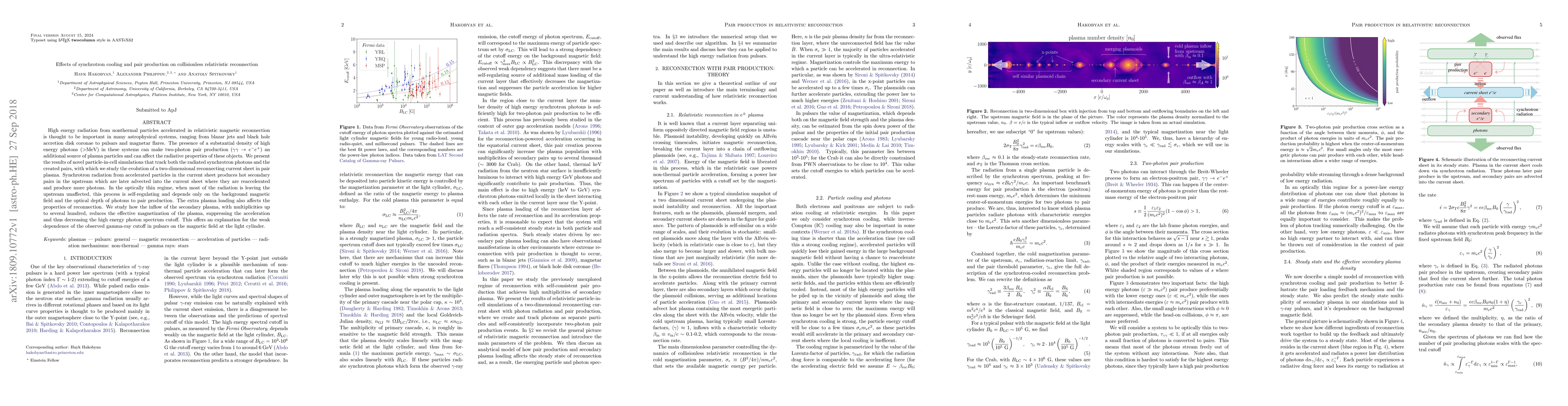 This paper investigates the impact of synchrotron cooling and pair production on collisionless relativistic reconnection, revealing that high energy photons from accelerated particles can generate secondary plasma pairs, influencing the reconnection process and the resulting high energy photon spectrum. The simulations show that the inflow of these secondary pairs reduces the effective magnetization, suppressing acceleration and explaining the weak dependence of gamma-ray cutoffs in pulsars on magnetic fields.