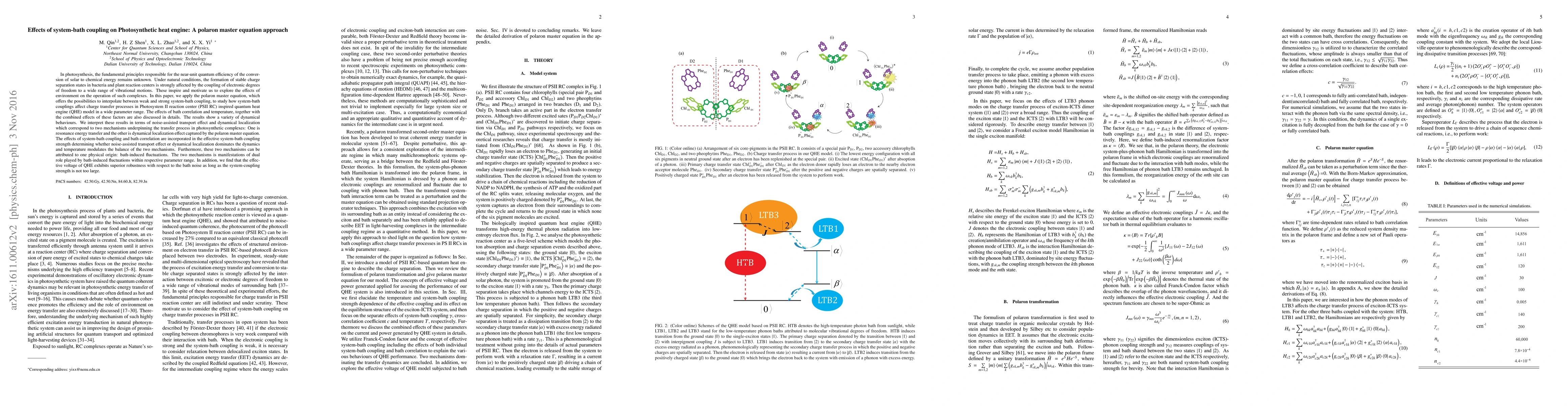 In this paper, we apply the polaron master equation, which offers the possibilities to interpolate between weak and strong system-bath coupling, to study how system-bath couplings affect charge transfer processes in Photosystem II reaction center (PSII RC) inspired quantum heat engine (QHE) model in a wide parameter range. The effects of bath correlation and temperature, together with the combined effects of these factors are also discussed in details. The results show a variety of dynamical behaviours. We interpret these results in terms of noise-assisted transport effect and dynamical localization which correspond to two mechanisms underpinning the transfer process in photosynthetic complexes: One is resonance energy transfer and the other is dynamical localization effect captured by the polaron master equation. The effects of system-bath coupling and bath correlation are incorporated in the effective system-bath coupling strength determining whether noise-assisted transport effect or dynamical localization dominates the dynamics and temperature modulates the balance of the two mechanisms. Furthermore, these two mechanisms can be attributed to one physical origin: bath-induced fluctuations. The two mechanisms is manifestations of dual role played by bath-induced fluctuations within respective parameter range. In addition, we find that the effec- tive voltage of QHE exhibits superior robustness with respect to the bath noise as long as the system-coupling strength is not too large.