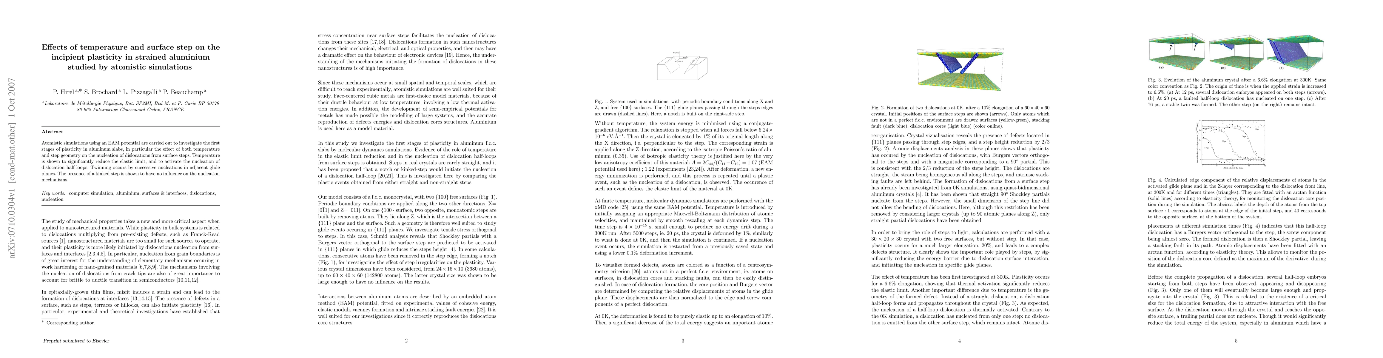 Atomistic simulations using an EAM potential are carried out to investigate the first stages of plasticity in aluminum slabs, in particular the effect of both temperature and step geometry on the nucleation of dislocations from surface steps. Temperature is shown to significantly reduce the elastic limit, and to activate the nucleation of dislocation half-loops. Twinning occurs by successive nucleations in adjacent glide planes. The presence of a kinked step is shown to have no influence on the nucleation mechanisms.