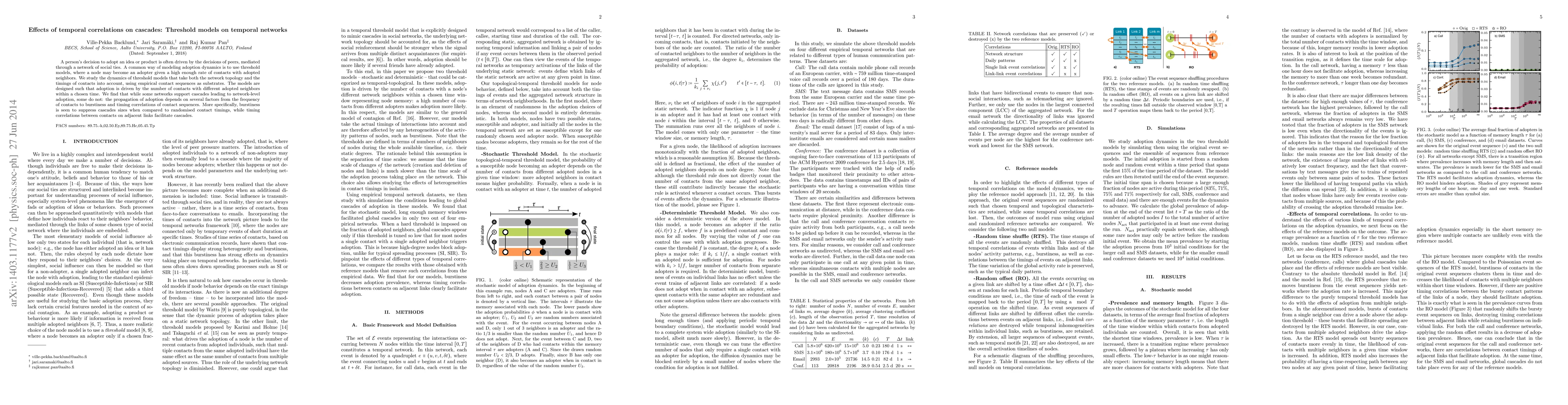 This paper investigates how temporal correlations in contact sequences influence the dynamics of threshold models on temporal networks, finding that burstiness suppresses cascades while timing correlations between contacts enhance them, ultimately affecting the likelihood of network-wide adoption.