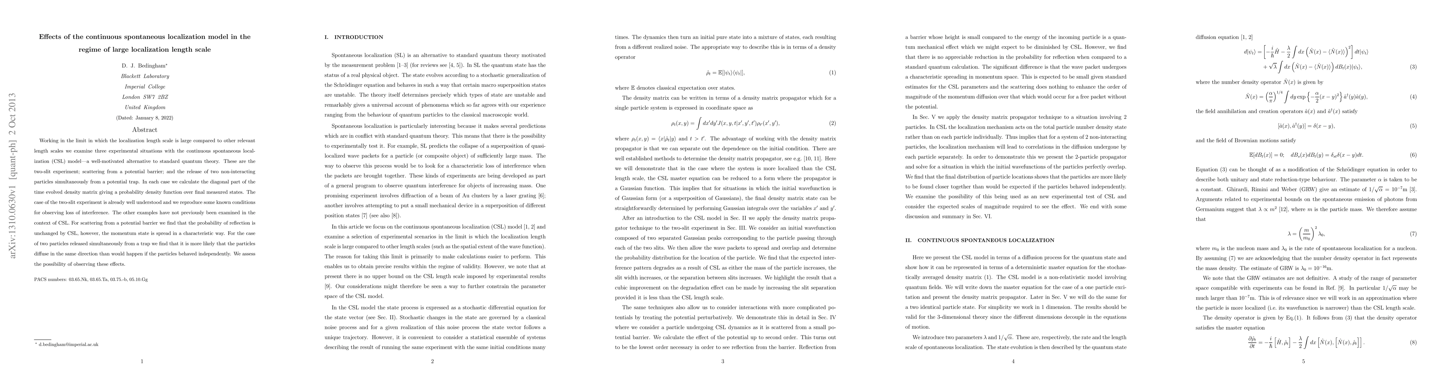 Working in the limit in which the localization length scale is large compared to other relevant length scales we examine three experimental situations with the continuous spontaneous localization (CSL) model---a well-motivated alternative to standard quantum theory. These are the two-slit experiment; scattering from a potential barrier; and the release of two non-interacting particles simultaneously from a potential trap. In each case we calculate the diagonal part of the time evolved density matrix giving a probability density function over final measured states. The case of the two-slit experiment is already well understood and we reproduce some known conditions for observing loss of interference. The other examples have not previously been examined in the context of CSL. For scattering from a potential barrier we find that the probability of reflection is unchanged by CSL, however, the momentum state is spread in a characteristic way. For the case of two particles released simultaneously from a trap we find that it is more likely that the particles diffuse in the same direction than would happen if the particles behaved independently. We assess the possibility of observing these effects.