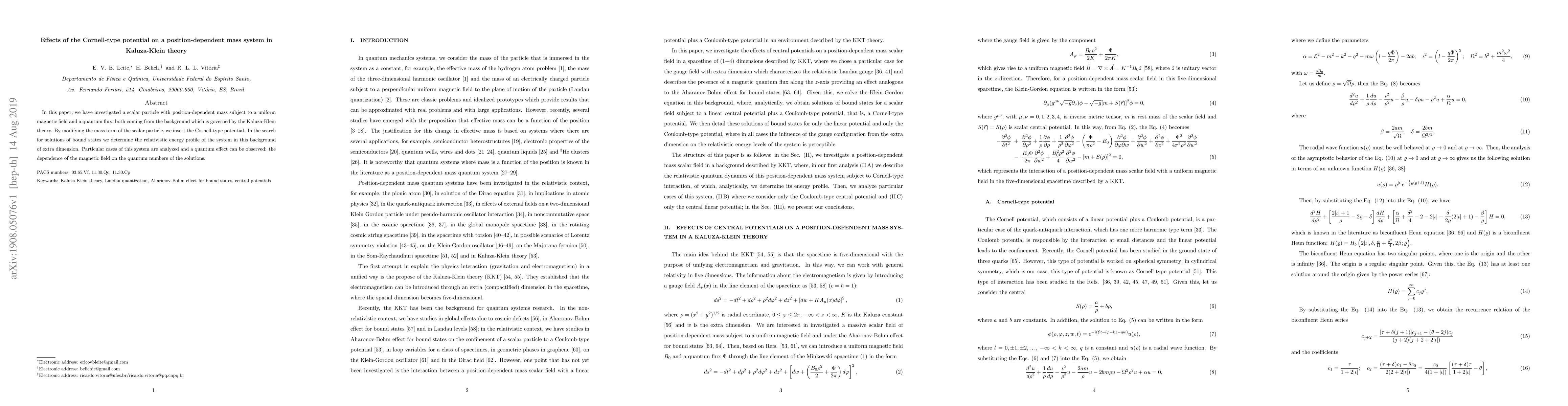 In this paper, we have investigated a scalar particle with position-dependent mass subject to a uniform magnetic field and a quantum flux, both coming from the background which is governed by the Kaluza-Klein theory. By modifying the mass term of the scalar particle, we insert the Cornell-type potential. In the search for solutions of bound states we determine the relativistic energy profile of the system in this background of extra dimension. Particular cases of this system are analyzed and a quantum effect can be observed: the dependence of the magnetic field on the quantum numbers of the solutions.
