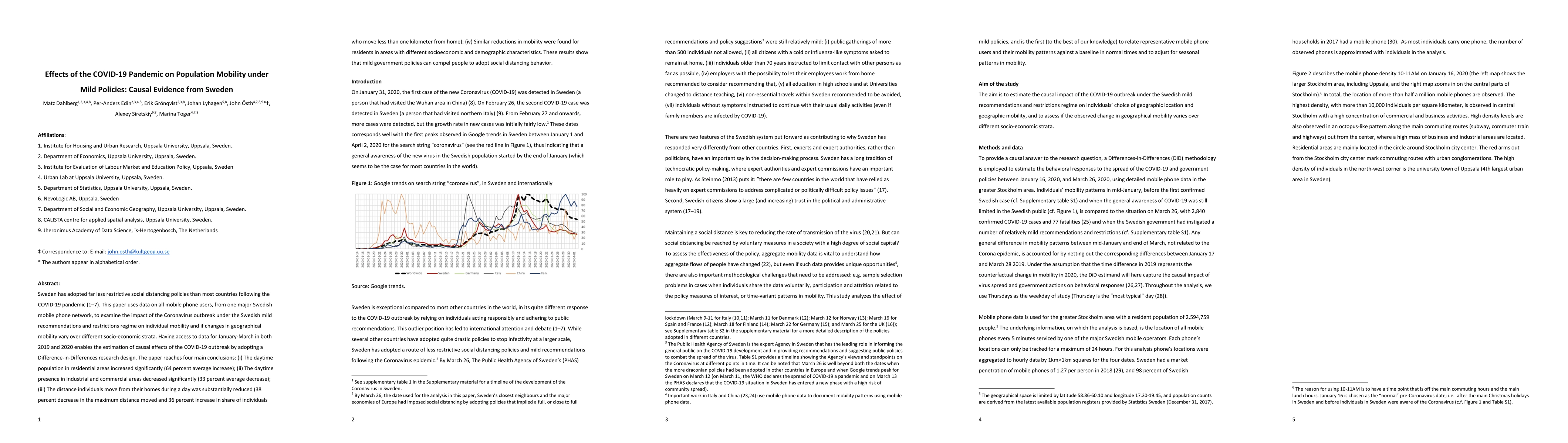 Sweden has adopted far less restrictive social distancing policies than most countries following the COVID-19 pandemic. This paper uses data on all mobile phone users, from one major Swedish mobile phone network, to examine the impact of the Coronavirus outbreak under the Swedish mild recommendations and restrictions regime on individual mobility and if changes in geographical mobility vary over different socio-economic strata. Having access to data for January-March in both 2019 and 2020 enables the estimation of causal effects of the COVID-19 outbreak by adopting a Difference-in-Differences research design. The paper reaches four main conclusions: (i) The daytime population in residential areas increased significantly (64 percent average increase); (ii) The daytime presence in industrial and commercial areas decreased significantly (33 percent average decrease); (iii) The distance individuals move from their homes during a day was substantially reduced (38 percent decrease in the maximum distance moved and 36 percent increase in share of individuals who move less than one kilometer from home); (iv) Similar reductions in mobility were found for residents in areas with different socioeconomic and demographic characteristics. These results show that mild government policies can compel people to adopt social distancing behavior.