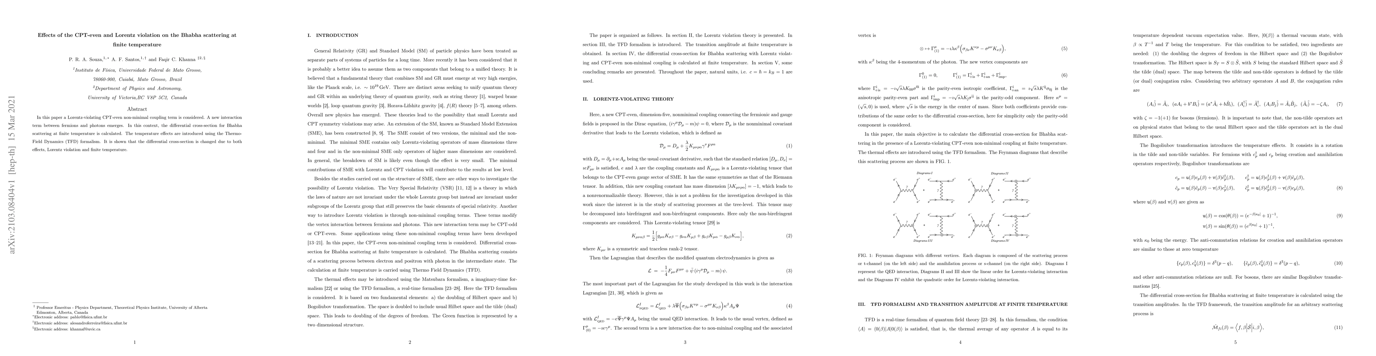 This paper investigates the impact of CPT-even Lorentz-violating terms on Bhabha scattering at finite temperature, introducing a new interaction term. The Thermo-Field Dynamics formalism is used to account for temperature effects, revealing that both Lorentz violation and finite temperature alter the differential cross-section.
