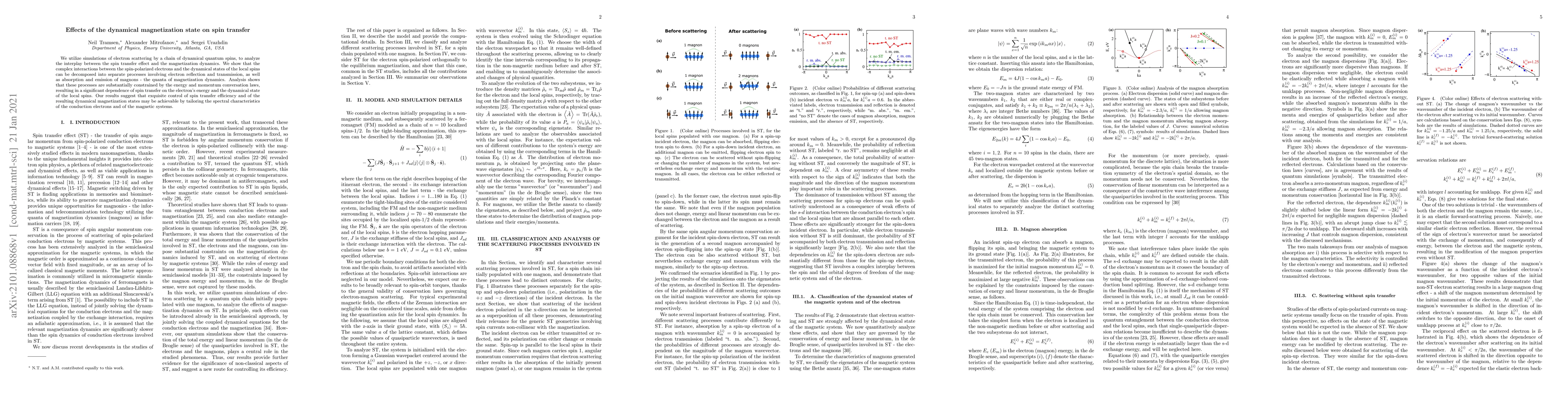 We utilize simulations of electron scattering by a chain of dynamical quantum spins, to analyze the interplay between the spin transfer effect and the magnetization dynamics. We show that the complex interactions between the spin-polarized electrons and the dynamical states of the local spins can be decomposed into separate processes involving electron reflection and transmission, as well as absorption and emission of magnons - the quanta of magnetization dynamics. Analysis shows that these processes are substantially constrained by the energy and momentum conversation laws, resulting in a significant dependence of spin transfer on the electron's energy and the dynamical state of the local spins. Our results suggest that exquisite control of spin transfer efficiency and of the resulting dynamical magnetization states may be achievable by tailoring the spectral characteristics of the conduction electrons and of the magnetic systems.