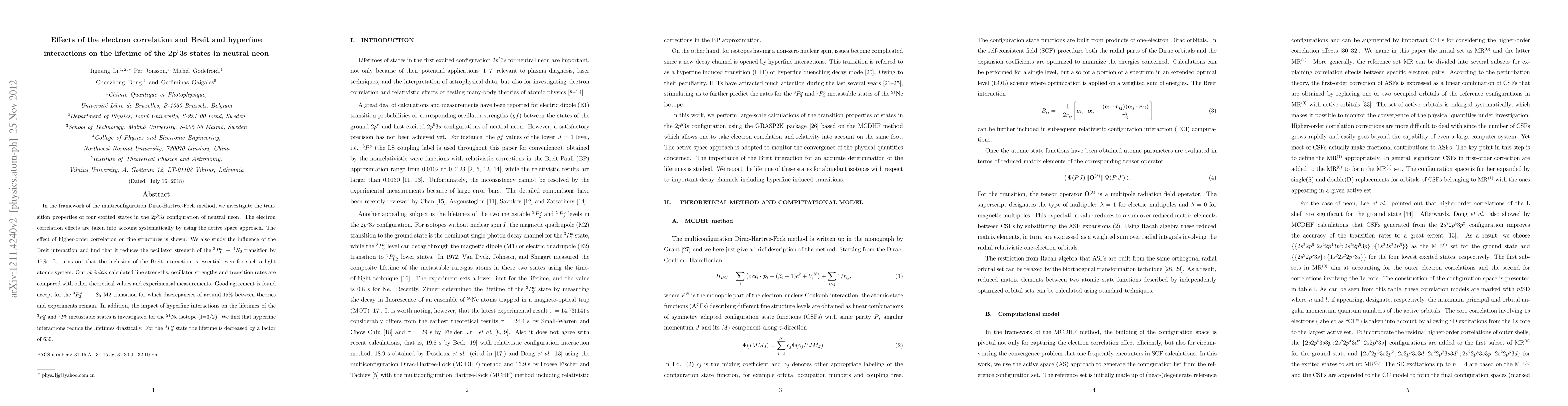 In the framework of the multiconfiguration Dirac-Hartree-Fock method, we investigate the transition properties of four excited states in the $2p^53s$ configuration of neutral neon. The electron correlation effects are taken into account systematically by using the active space approach. The effect of higher-order correlation on fine structures is shown. We also study the influence of the Breit interaction and find that it reduces the oscillator strength of the $^3P^o_1 - ^1S_0$ transition by 17%. It turns out that the inclusion of the Breit interaction is essential even for such a light atomic system. Our ab initio calculated line strengths, oscillator strengths and transition rates are compared with other theoretical values and experimental measurements. Good agreement is found except for the $^3P^o_2 - ^1S_0$ M2 transition for which discrepancies of around 15% between theories and experiments remain. In addition, the impact of hyperfine interactions on the lifetimes of the $^3P^o_0$ and $^3P^o_2$ metastable states is investigated for the $^{21}$Ne isotope (I=3/2). We find that hyperfine interactions reduce the lifetimes drastically. For the $^3P^o_0$ state the lifetime is decreased by a factor of 630.