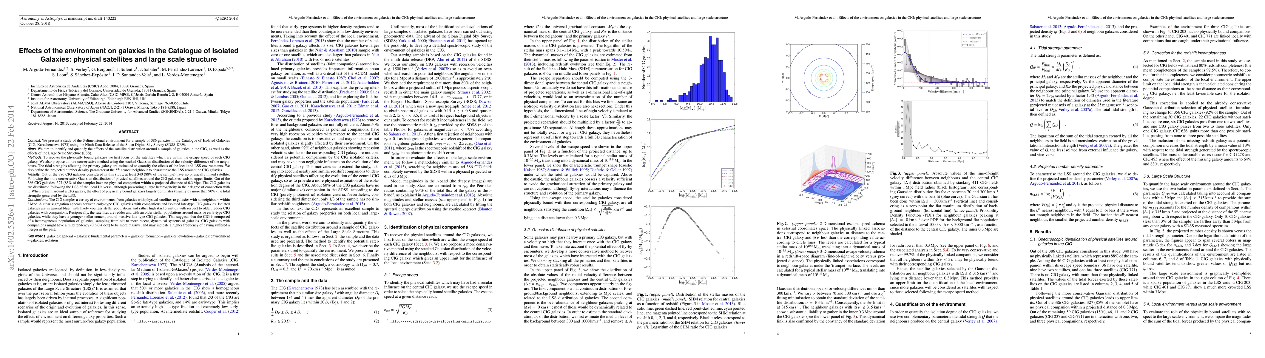 We aim to identify and quantify the effects of the satellite distribution around a sample of galaxies in the Catalogue of Isolated Galaxies (CIG), as well as the effects of the Large Scale Structure (LSS) using the SDSS-DR9. To recover the physically bound galaxies we focus on the satellites which are within the escape speed of each CIG galaxy. We also propose a more conservative method using the stacked Gaussian distribution of the velocity difference of the neighbours. The tidal strengths affecting the primary galaxy are estimated to quantify the effects of the local and LSS environments. We also define the projected number density parameter at the 5$^{\rm th}$ nearest neighbour to characterise the LSS around the CIG galaxies. Out of the 386 CIG galaxies considered in this study, at least 340 (88\% of the sample) have no physically linked satellite. Out of the 386 CIG galaxies, 327 (85\% of the sample) have no physical companion within a projected distance of 0.3 Mpc. The CIG galaxies are distributed following the LSS of the local Universe, although presenting a large heterogeneity in their degree of connection with it. A clear segregation appears between early-type CIG galaxies with companions and isolated late-type CIG galaxies. Isolated galaxies are in general bluer, with likely younger stellar populations and rather high star formation with respect to older, redder CIG galaxies with companions. Reciprocally, the satellites are redder and with an older stellar populations around massive early-type CIG galaxies, while they have a younger stellar content around massive late-type CIG galaxies. This suggests that the CIG is composed of a heterogeneous population of galaxies, sampling from old to more recent, dynamical systems of galaxies.