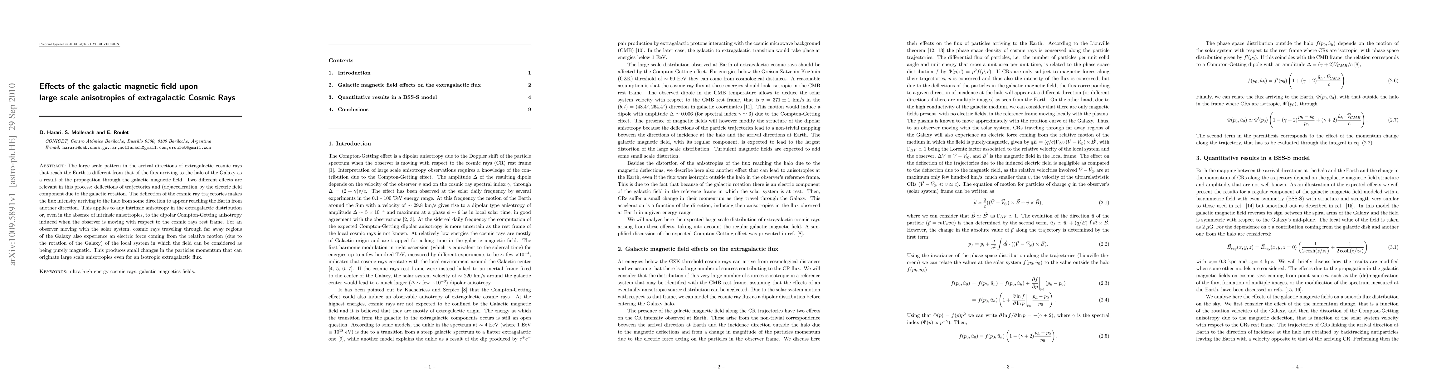 This paper investigates how the galactic magnetic field influences the large-scale anisotropies in the arrival directions of extragalactic cosmic rays reaching Earth. The study highlights two key effects: trajectory deflections and (de)acceleration by the electric field component due to galactic rotation, which can create apparent anisotropies even in the absence of intrinsic cosmic ray distribution anisotropies.