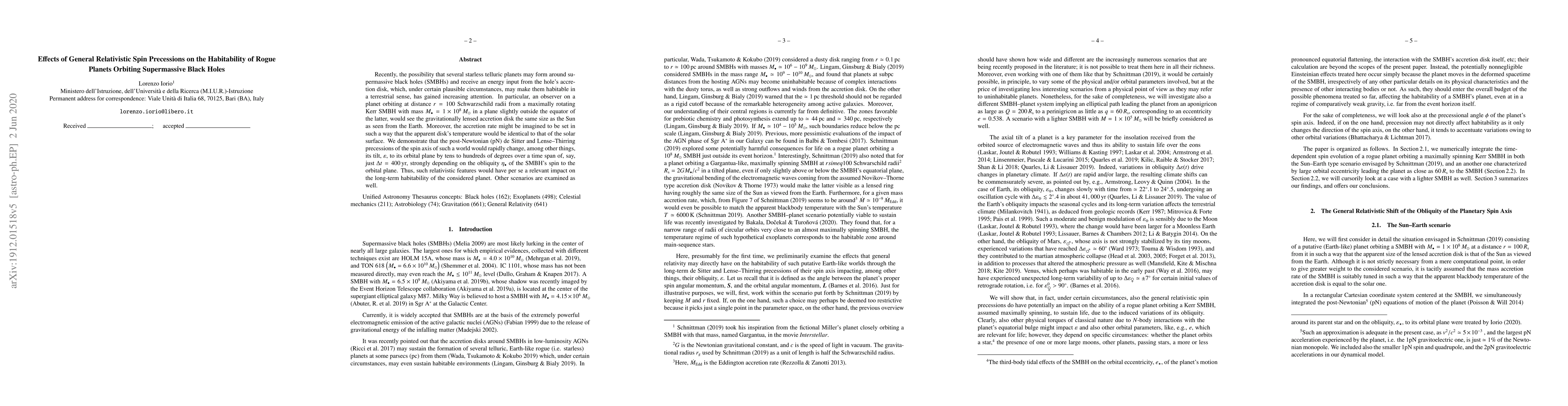 Recently, the possibility that several starless telluric planets may form around supermassive black holes (SMBHs) and receive an energy input from the hole's accretion disk, which, under certain plausible circumstances, may make them habitable in a terrestrial sense, has gained increasing attention. In particular, an observer on a planet orbiting at distance $r=100$ Schwarzschild radii from a maximally rotating Kerr SMBH with mass $M_\bullet = 1\times 10^8\,M_\odot$ in a plane slightly outside the equator of the latter, would see the gravitationally lensed accretion disk the same size as the Sun as seen from the Earth. Moreover, the accretion rate might be imagined to be set in such a way that the apparent disk's temperature would be identical to that of the solar surface. We demonstrate that the post-Newtonian (pN) de Sitter and Lense--Thirring precessions of the spin axis of such a world would rapidly change, among other things, its tilt, $\varepsilon$, to its orbital plane by tens to hundreds of degrees over a time span of, say, just $\Delta t =400\,\mathrm{yr}$, strongly depending on the obliquity $\eta_\bullet$ of the SMBH's spin to the orbital plane. Thus, such relativistic features would have per se a relevant impact on the long-term habitability of the considered planet. Other scenarios are examined as well.