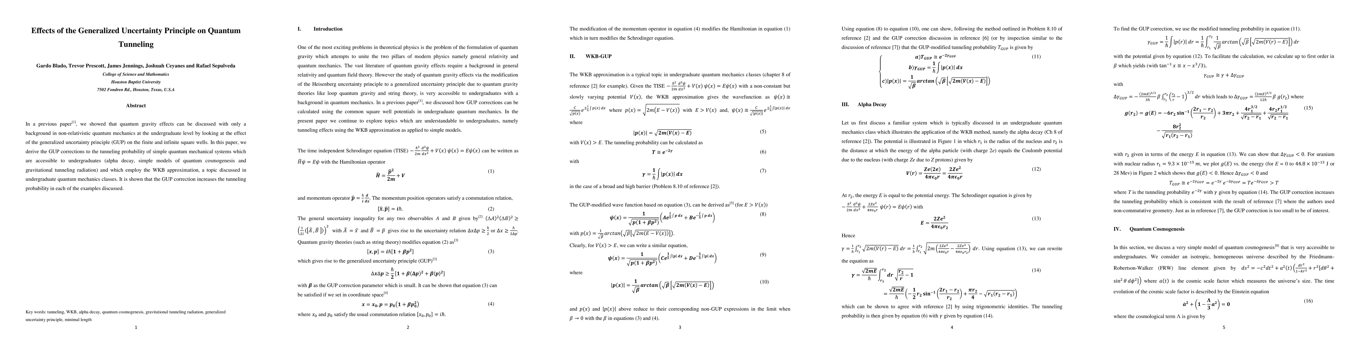 In a previous paper [Blado G, Owens C, and Meyers V 2014 Quantum Wells and the Generalized Uncertainty Principle Eur. J. Phys. 35 065011], we showed that quantum gravity effects can be discussed with only a background in non-relativistic quantum mechanics at the undergraduate level by looking at the effect of the generalized uncertainty principle (GUP) on the finite and infinite square wells. In this paper, we derive the GUP corrections to the tunneling probability of simple quantum mechanical systems which are accessible to undergraduates (alpha decay, simple models of quantum cosmogenesis and gravitational tunneling radiation) and which employ the WKB approximation, a topic discussed in undergraduate quantum mechanics classes. It is shown that the GUP correction increases the tunneling probability in each of the examples discussed.