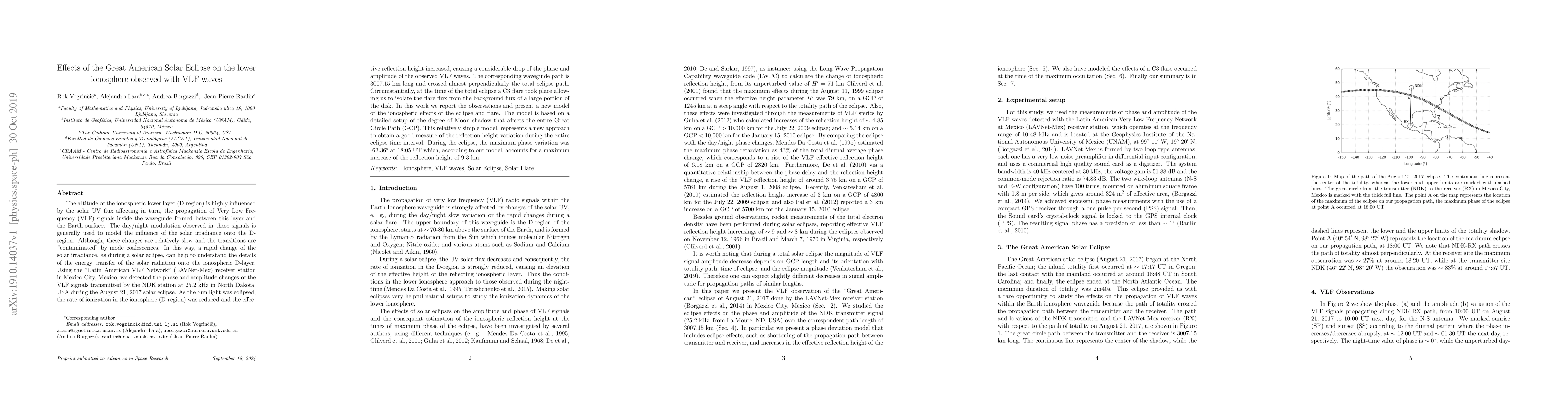 This study investigates the impact of the 2017 Great American Solar Eclipse on the lower ionosphere (D-region) using VLF wave observations. The eclipse caused a significant drop in VLF signal phase and amplitude due to reduced ionization and increased reflection height, with a maximum phase variation of -63.36°, corresponding to a 9.3 km rise in reflection height, as modeled based on the Moon's shadow path.