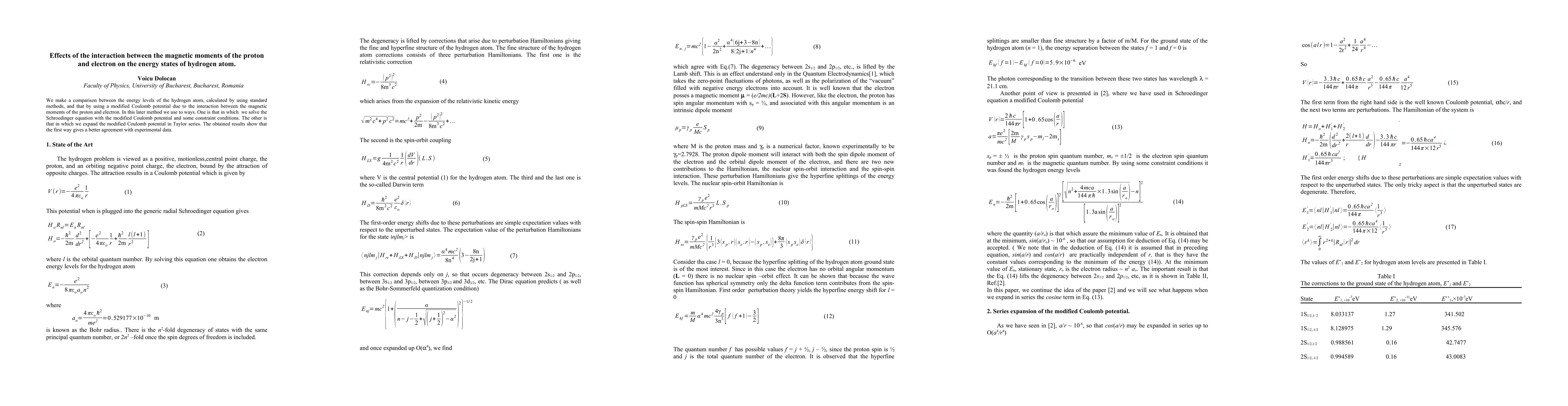 This paper compares hydrogen atom energy levels calculated using standard methods and a modified Coulomb potential accounting for proton-electron magnetic moment interaction. The modified potential is solved via Schrödinger equation and Taylor series expansion, with the former yielding better experimental agreement.