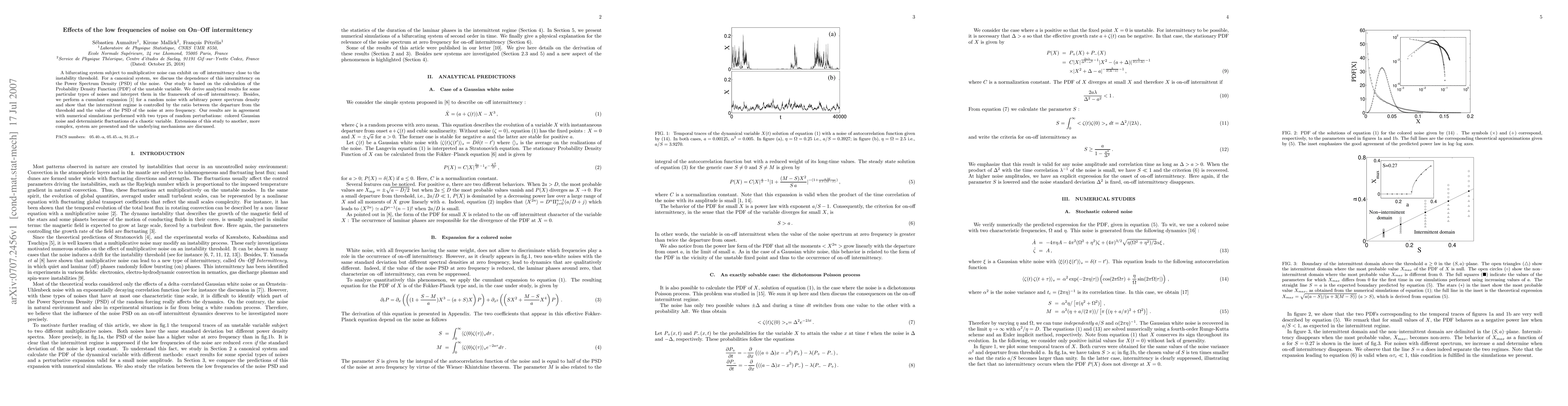 This paper investigates how low-frequency noise affects on-off intermittency in bifurcating systems near instability thresholds. Analytical results show that the intermittent regime is governed by the ratio of the threshold departure to the noise's power spectrum density at zero frequency, corroborated by numerical simulations using colored Gaussian noise and chaotic variable fluctuations.