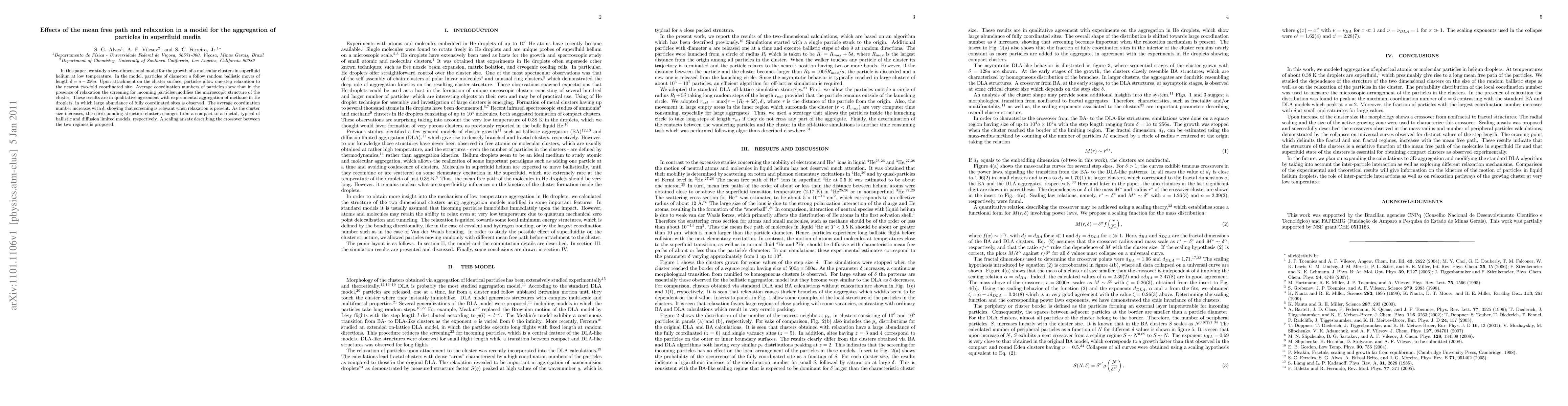 In this paper, we study a two-dimensional model for the growth of molecular clusters in superfluid helium at low temperature. In the model, particles of diameter a follow random ballistic moves of length \delta = a-256a. Upon attachment on the cluster surface, particles allow one-step relaxation to the nearest twofold coordinated site. Average coordination numbers of particles show that in the presence of relaxation the screening for incoming particles modifies the microscopic structure of the cluster. These results are in qualitative agreement with experimental aggregation of methane in He droplets, in which large abundance of fully coordinated sites is observed. The average coordination number increases with \delta, showing that screening is relevant when relaxation is present. As the cluster size increases, the corresponding structure clusters changes from a compact to a fractal, typical of ballistic and diffusion limited models, respectively. A scaling ansatz describing the crossover between the two regimes is proposed.