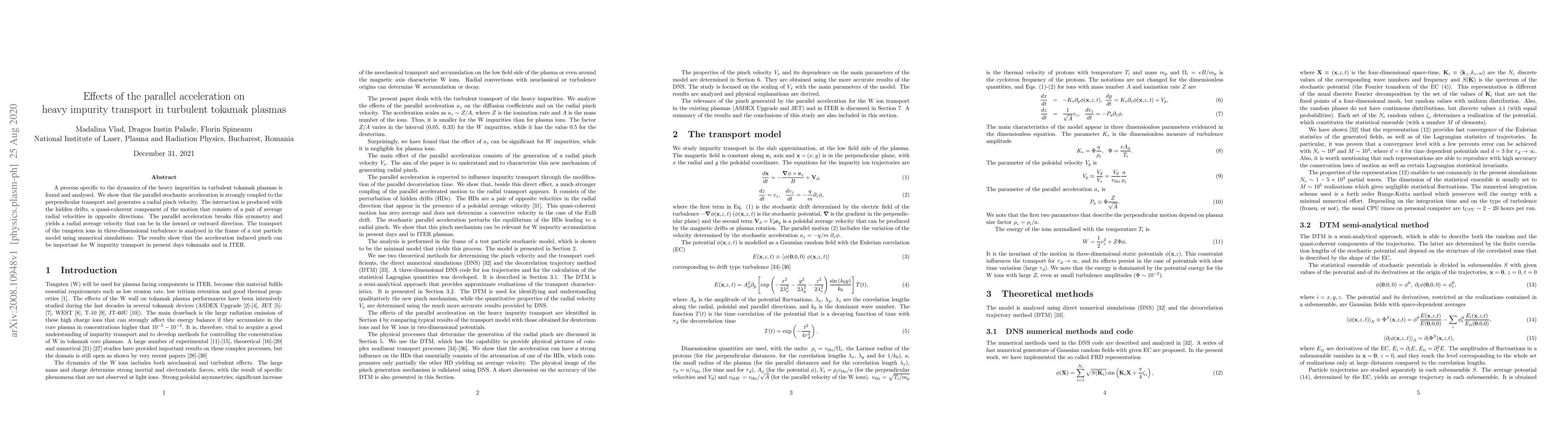 This paper investigates the impact of parallel stochastic acceleration on heavy impurity transport in turbulent tokamak plasmas, revealing a coupling mechanism that results in a radial pinch velocity. The study uses numerical simulations to demonstrate that this effect can significantly influence the transport of tungsten ions, suggesting its importance for current and future fusion reactors like ITER.