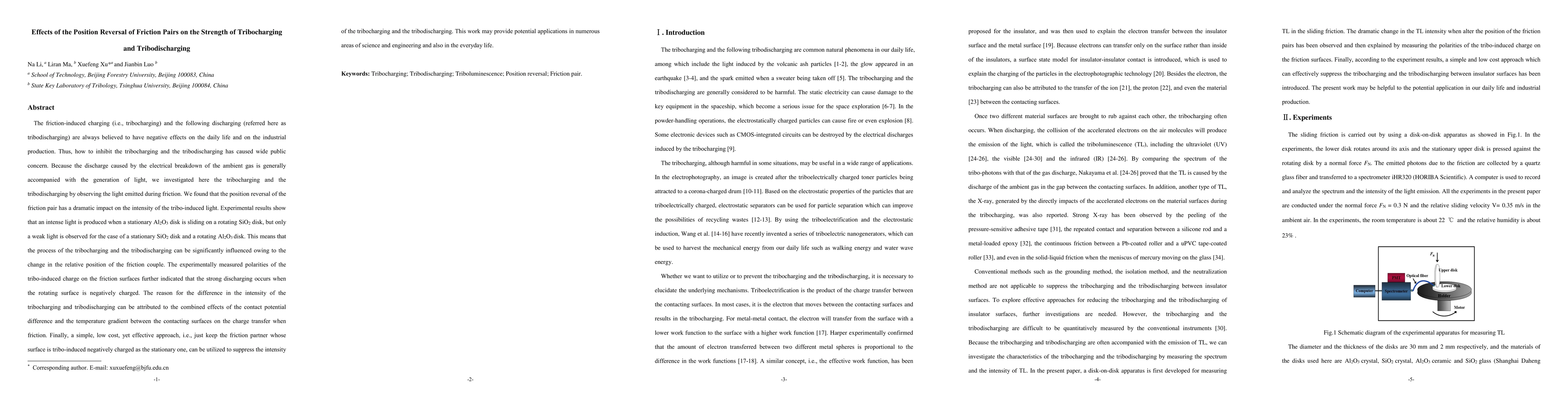 The friction-induced charging (i.e., tribocharging) and the following discharging (referred here as tribodischarging) are always believed to have negative effects on the daily life and on the industrial production. Thus, how to inhibit the tribocharging and the tribodischarging has caused wide public concern. Because the discharge caused by the electrical breakdown of the ambient gas is generally accompanied with the generation of light, we investigated here the tribocharging and the tribodischarging by observing the light emitted during friction. We found that the position reversal of the friction pair has a dramatic impact on the intensity of the tribo-induced light. Experimental results show that an intense light is produced when a stationary Al2O3 disk is sliding on a rotating SiO2 disk, but only a weak light is observed for the case of a stationary SiO2 disk and a rotating Al2O3 disk. This means that the process of the tribocharging and the tribodischarging can be significantly influenced owing to the change in the relative position of the friction couple. The experimentally measured polarities of the tribo-induced charge on the friction surfaces further indicated that the strong discharging occurs when the rotating surface is negatively charged. The reason for the difference in the intensity of the tribocharging and tribodischarging can be attributed to the combined effects of the contact potential difference and the temperature gradient between the contacting surfaces on the charge transfer when friction. Finally, a simple, low cost, yet effective approach, i.e., just keep the friction partner whose surface is tribo-induced negatively charged as the stationary one, can be utilized to suppress the intensity of the tribocharging and the tribodischarging. This work may provide potential applications in numerous areas of science and engineering and also in the everyday life.