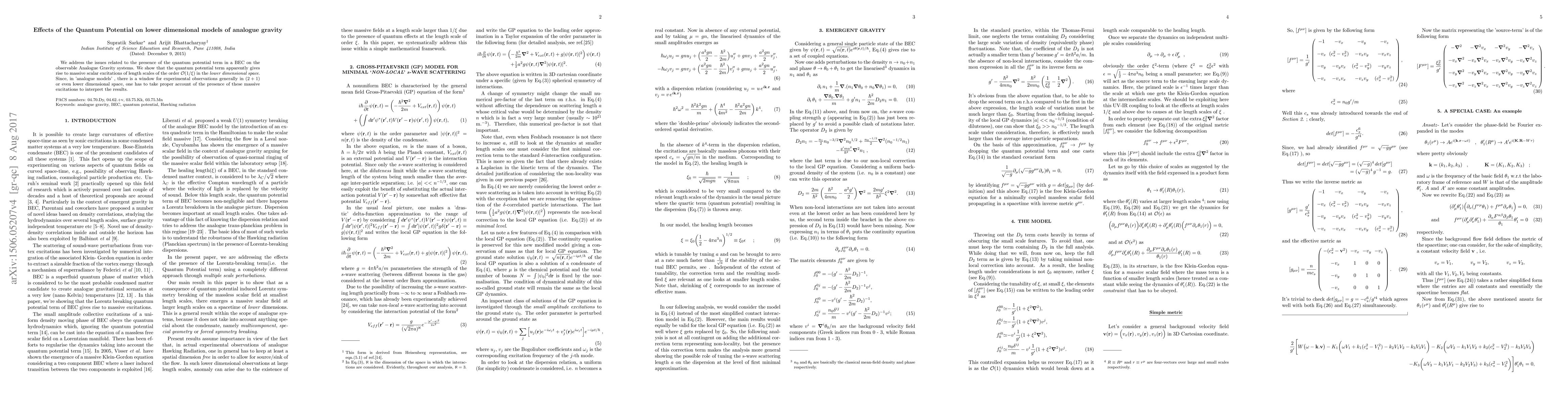 We address the issues related to the presence of the quantum potential term in a BEC on the observable Analogue Gravity systems. We show that the quantum potential term apparently gives rise to massive scalar excitations of length scales of the order $\mathcal{O}(1/\xi)$ in the lower dimensional space. Since, in 'analogue models', there is a window for experimental observations generally in (2 + 1) or even lower dimensional space, one has to take proper account of the presence of these massive excitations to interpret the results.