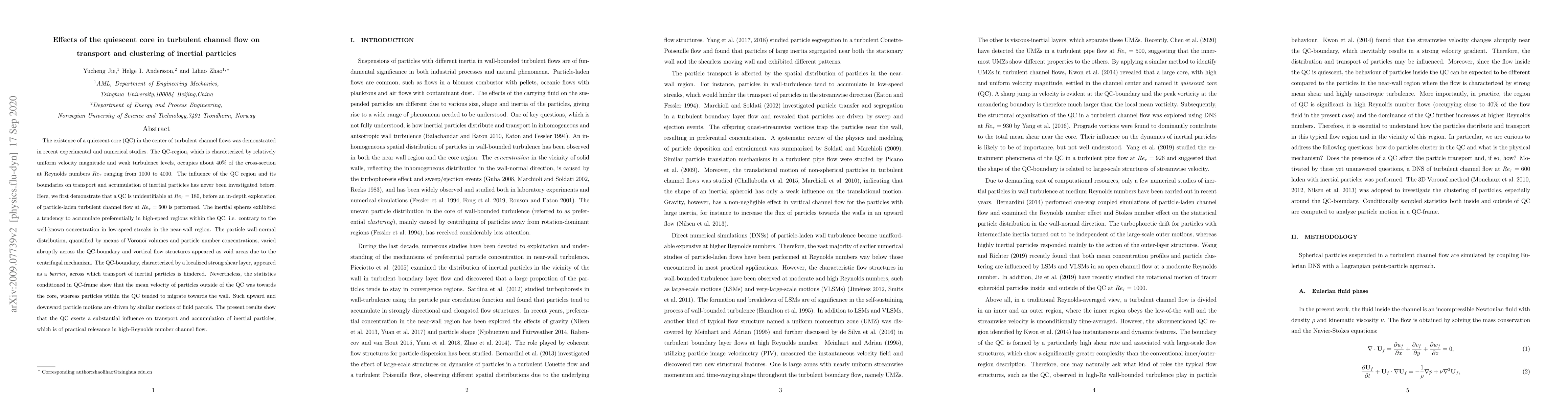 This study investigates the impact of the quiescent core in turbulent channel flow on the transport and clustering of inertial particles. At higher Reynolds numbers, inertial particles tend to accumulate in high-speed regions within the core, while the core boundary acts as a barrier to particle transport, influencing their vertical distribution and migration patterns.