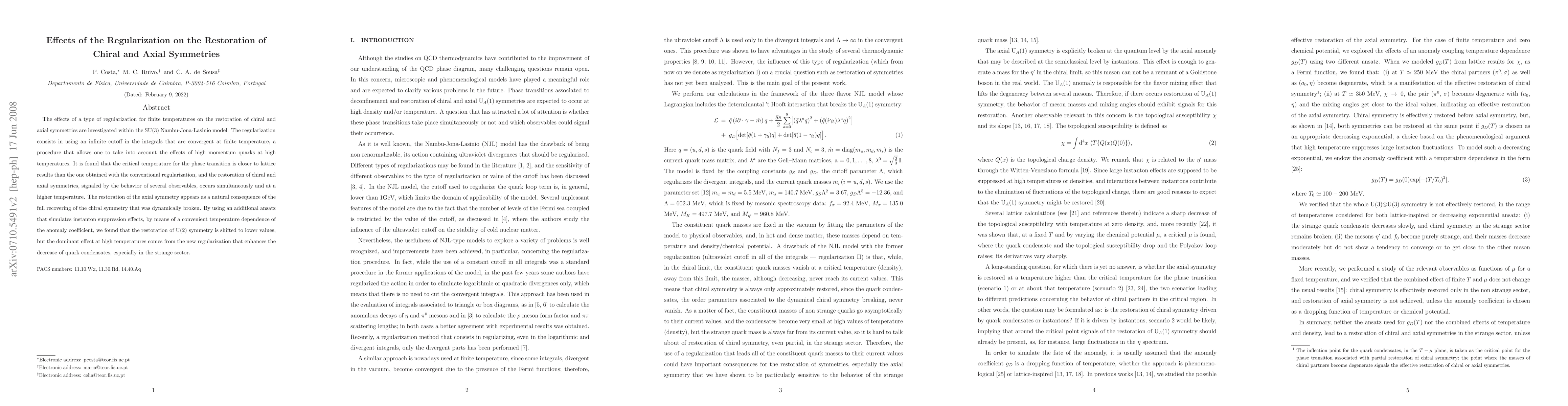 The effects of a type of regularization for finite temperatures on the estoration of chiral and axial symmetries are investigated within the SU(3) Nambu-Jona-Lasinio model. The regularization consists in using an infinite cutoff in the integrals that are convergent at finite temperature, a procedure that allows one to take into account the effects of high momentum quarks at high temperatures. It is found that the critical temperature for the phase transition is closer to lattice results than the one obtained with the conventional regularization, and the restoration of chiral and axial symmetries, signaled by the behavior of several observables, occurs simultaneously and at a higher temperature. The restoration of the axial symmetry appears as a natural consequence of the full recovering of the chiral symmetry that was dynamically broken. By using an additional ansatz that simulates instanton suppression effects, by means of a convenient temperature dependence of the anomaly coefficient, we found that the restoration of U(2) symmetry is shifted to lower values, but the dominant effect at high temperatures comes from the new regularization that enhances the decrease of quark condensates, especially in the strange sector.