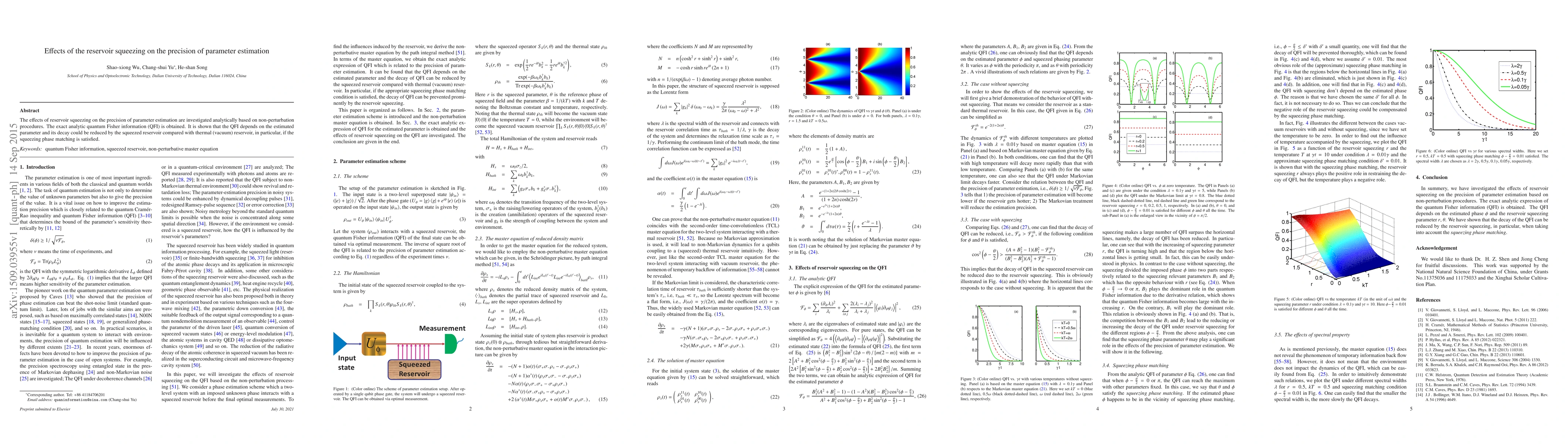 The research uses non-perturbative procedures to investigate the effects of reservoir squeezing on the precision of parameter estimation, deriving a master equation via the path integral method and obtaining the exact analytic expression for the quantum Fisher information (QFI).