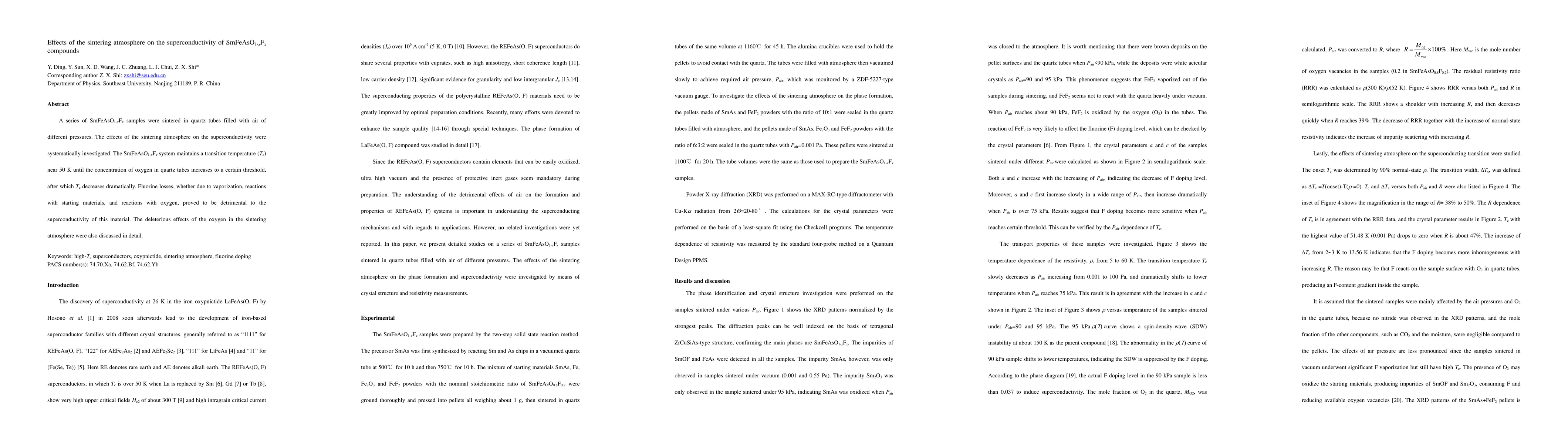 SmFeAsO1-xFx compounds maintain superconductivity near 50 K when sintered under low oxygen pressure; however, increased oxygen concentration leads to a sharp decline in transition temperature due to fluorine losses.