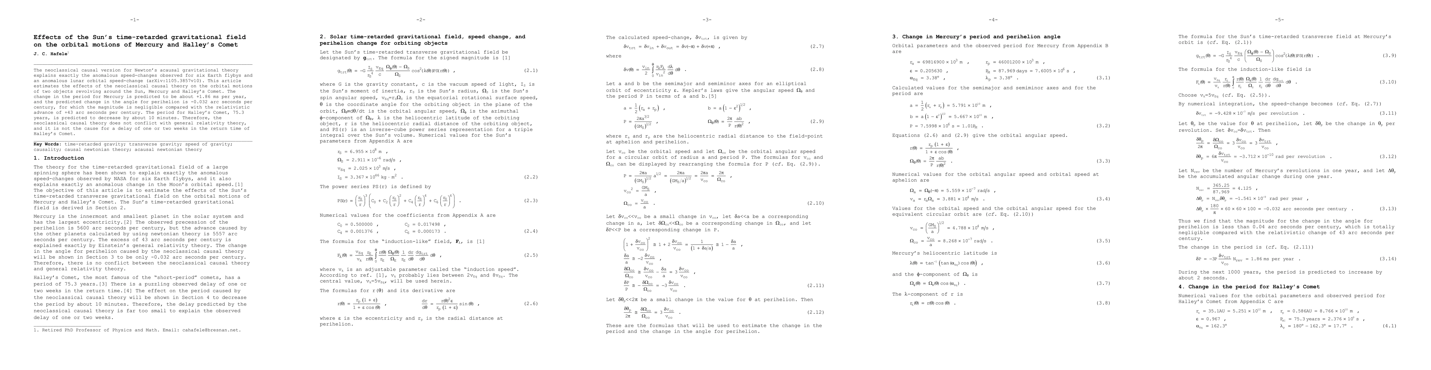 The neoclassical causal version for Newton's acausal gravitational theory explains exactly the anomalous speed-changes observed for six Earth flybys and an anomalous lunar orbital speed-change (arXiv:1105.3857v10). This article estimates the effects of the neoclassical causal theory on the orbital motions of two objects revolving around the Sun, Mercury and Halley's Comet. The change in the period for Mercury is predicted to be about +1.86 ms per year, and the predicted change in the angle for perihelion is -0.032 arc seconds per century, for which the magnitude is negligible compared with the relativistic advance of +43 arc seconds per century. The period for Halley's Comet, 75.3 years, is predicted to decrease by about 10 minutes. Therefore, the neoclassical causal theory does not conflict with general relativity theory, and it is not the cause for a delay of one or two weeks in the return time of Halley's Comet.