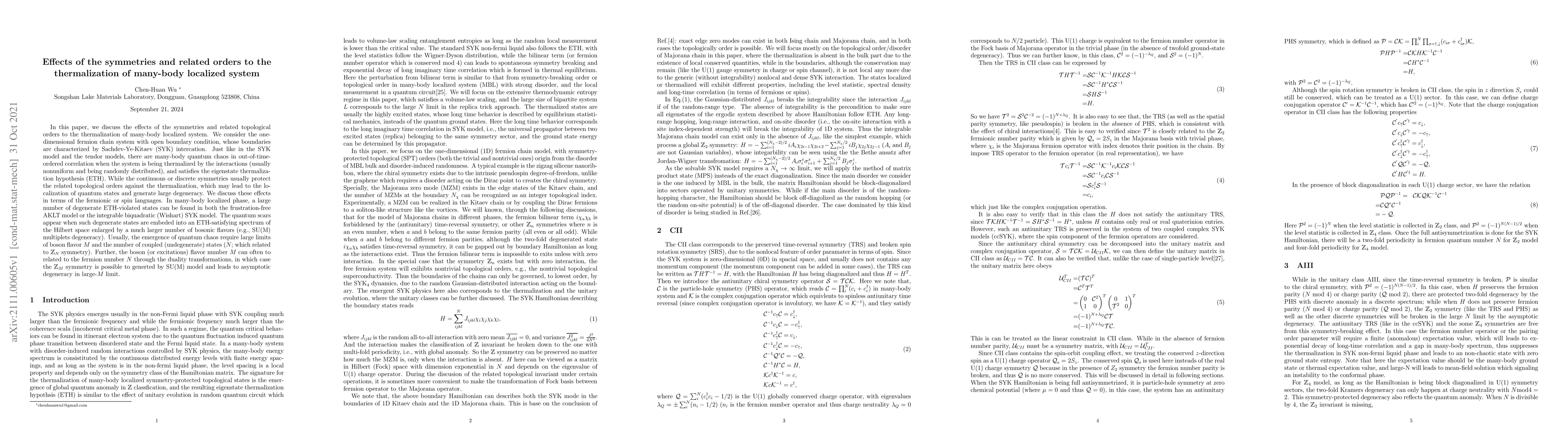In this paper, we discuss the effects of the symmetries and related topological orders to the thermalization of many-body localized system. We consider the one-dimensional fermion chain system with open (or periodic) boundary condition, whose boundaries are characterized by Sachdev-Ye-Kitaev (SYK) intercation. Just like in the SYK model and the tendor models, there are many-body quantum chaos in out-of-time-ordered correlation when the system is being thermalized by the interactions (usually nonuniform and being randomly distributed), and satisfies the eigenstate thermalization hypothesis (ETH). While the continuous or discrete symmetries usually protect the related topological orders against the thermalization, which may lead to the localization of quantum states and generate large degeneracy. We discuss these effects in terms of the fermionic or spin languages. In many-body localized phase, a large number of degenerate ETH-violated states can be found in both the frustration-free AKLT model or the integrable biquadratic (Wishart) SYK model. The quantum scars appear when such degenerate states are embeded into an ETH-satisfying spectrum of the Hilbert space enlarged by a much larger number of bosonic flavors (e.g., SU(M) multiplets degeneracy). Usually, the emergence of quantum chaos require large limits of boson flavor M and the number of coupled (undegenerate) states (N; which related to Z N symmetry). Further, the boson (or excitations) flavor number M can often to related to the fermion number N through the duality transformations, in which case the Z M symmetry is possible to generted by SU(M) model and leads to asymptotic degeneracy in large-M limit.