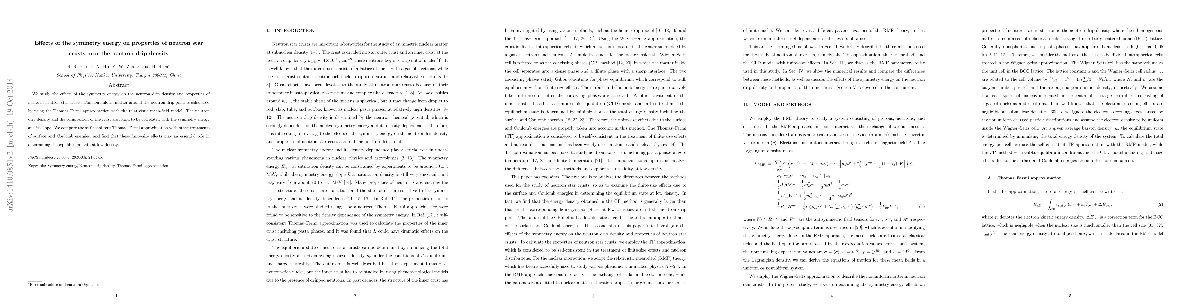 We study the effects of the symmetry energy on the neutron drip density and properties of nuclei in neutron star crusts. The nonuniform matter around the neutron drip point is calculated by using the Thomas--Fermi approximation with the relativistic mean-field model. The neutron drip density and the composition of the crust are found to be correlated with the symmetry energy and its slope. We compare the self-consistent Thomas--Fermi approximation with other treatments of surface and Coulomb energies and find that these finite-size effects play an essential role in determining the equilibrium state at low density.