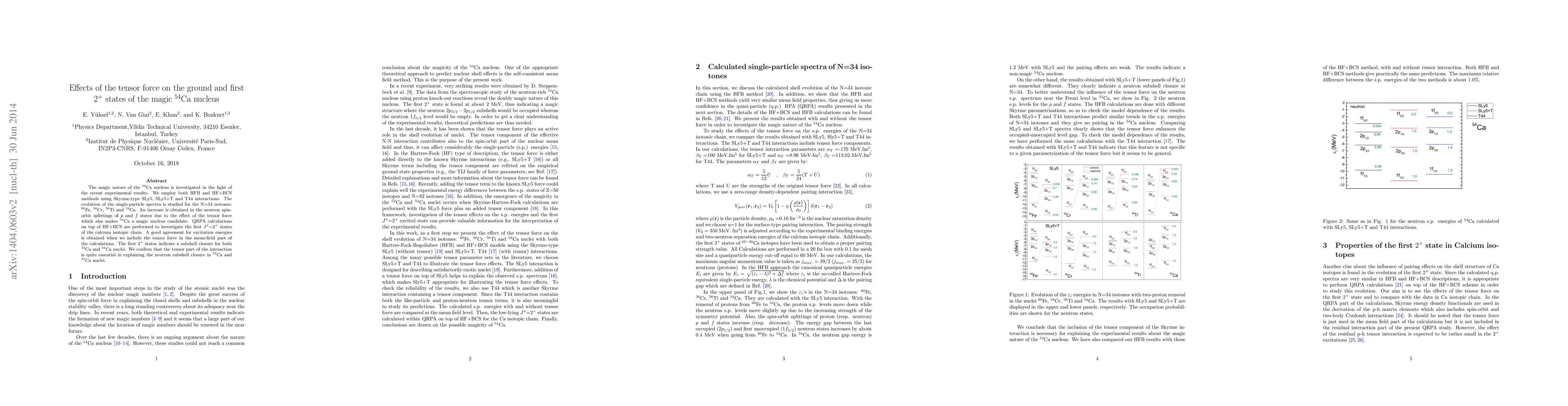 The magic nature of the $^{54}$Ca nucleus is investigated in the light of the recent experimental results. We employ both HFB and HF+BCS methods using Skyrme-type SLy5, SLy5+T and T44 interactions. The evolution of the single-particle spectra is studied for the N=34 isotones: $^{60}$Fe, $^{58}$Cr, $^{56}$Ti and $^{54}$Ca. An increase is obtained in the neutron spin-orbit splittings of $p$ and $f$ states due to the effect of the tensor force which also makes $^{54}$Ca a magic nucleus candidate. QRPA calculations on top of HF+BCS are performed to investigate the first $J^{\pi}$=$2^{+}$ states of the calcium isotopic chain. A good agreement for excitation energies is obtained when we include the tensor force in the mean-field part of the calculations. The first $2^{+}$ states indicate a subshell closure for both $^{52}$Ca and $^{54}$Ca nuclei. We confirm that the tensor part of the interaction is quite essential in explaining the neutron subshell closure in $^{52}$Ca and $^{54}$Ca nuclei.