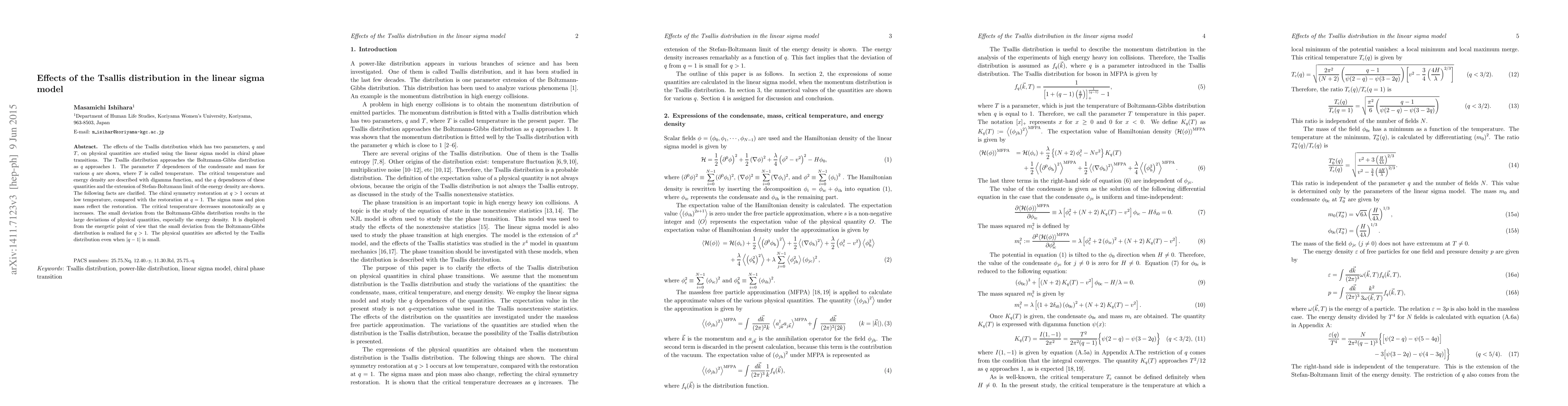 The effects of the Tsallis distribution which has two parameters, $q$ and $T$,on physical quantities are studied using the linear sigma model in chiral phase transitions. The Tsallis distribution approaches the Boltzmann-Gibbs distribution as $q$ approaches $1$. The parameter $T$ dependences of the condensate and mass for various $q$ are shown, where $T$ is called temperature. The critical temperature and energy density are described with digamma function, and the $q$ dependences of these quantities and the extension of Stefan-Boltzmann limit of the energy density are shown. The following facts are clarified. The chiral symmetry restoration at $q>1$ occurs at low temperature, compared with the restoration at $q=1$.The sigma mass and pion mass reflect the restoration. The critical temperature decreases monotonically as $q$ increases. The small deviation from the Boltzmann-Gibbs distribution results in the large deviations of physical quantities, especially the energy density. It is displayed from the energetic point of view that the small deviation from the Boltzmann-Gibbs distribution is realized for $q>1$. The physical quantities are affected by the Tsallis distribution even when $|q-1|$ is small.
