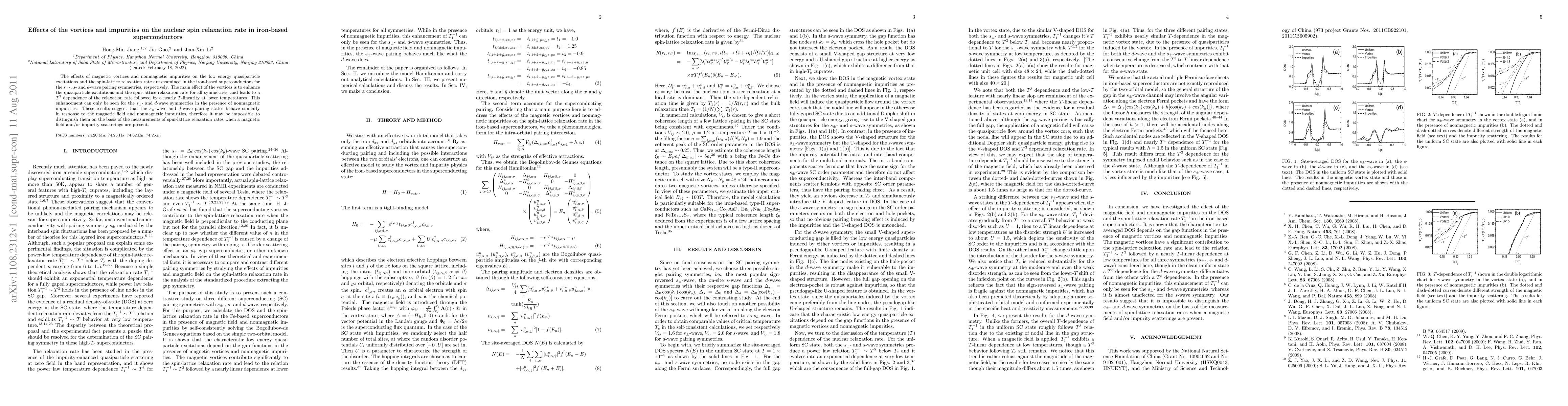 This study investigates how magnetic vortices and nonmagnetic impurities affect the nuclear spin relaxation rate in iron-based superconductors with different pairing symmetries. The results show that vortices enhance relaxation rates, while nonmagnetic impurities only enhance this effect in $s_{\pm}$- and d-wave pairing states, complicating their distinction based on spin-lattice relaxation measurements.