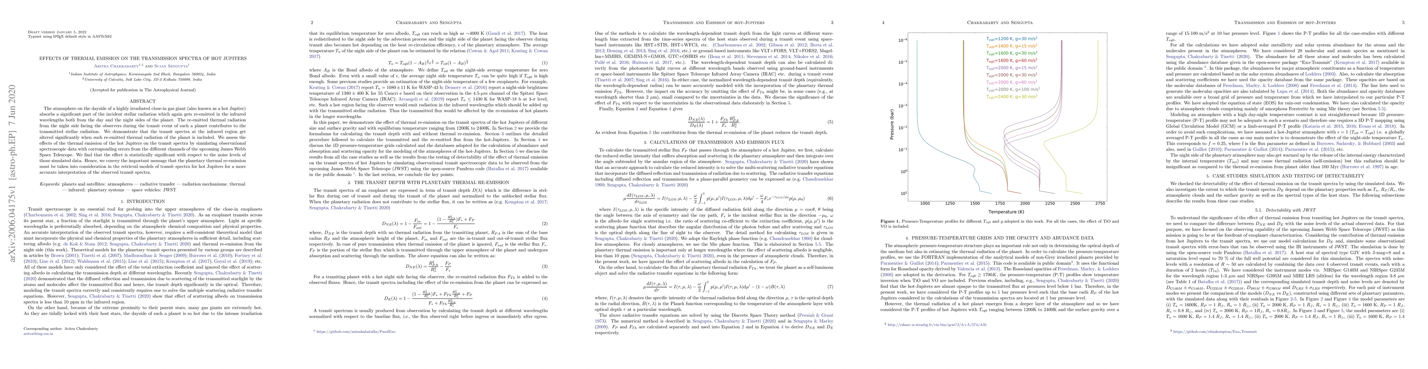 This study investigates how thermal emission from the night side of hot Jupiters affects their transmission spectra during transit events, demonstrating significant alterations in the infrared region. The research emphasizes the necessity of including planetary thermal re-emission in transit spectral models for accurate interpretation, using simulations from the James Webb Space Telescope.