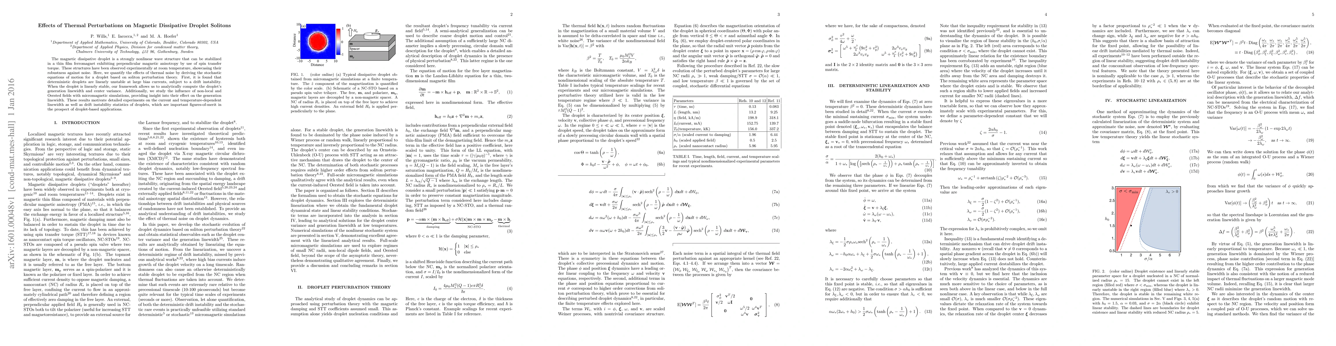 The magnetic dissipative droplet is a strongly nonlinear wave structure that can be stabilized in a thin film ferromagnet exhibiting perpendicular magnetic anisotropy by use of spin transfer torque. These structures have been observed experimentally at room temperature, showcasing their robustness against noise. Here, we quantify the effects of thermal noise by deriving the stochastic equations of motion for a droplet based on soliton perturbation theory. First, it is found that deterministic droplets are linearly unstable at large bias currents, subject to a drift instability. When the droplet is linearly stable, our framework allows us to analytically compute the droplet's generation linewidth and center variance. Additionally, we study the influence of non-local and Oersted fields with micromagnetic simulations, providing insight into their effect on the generation linewidth. These results motivate detailed experiments on the current and temperature-dependent linewidth as well as drift instability statistics of droplets, which are important figures-of-merit in the prospect of droplet-based applications.