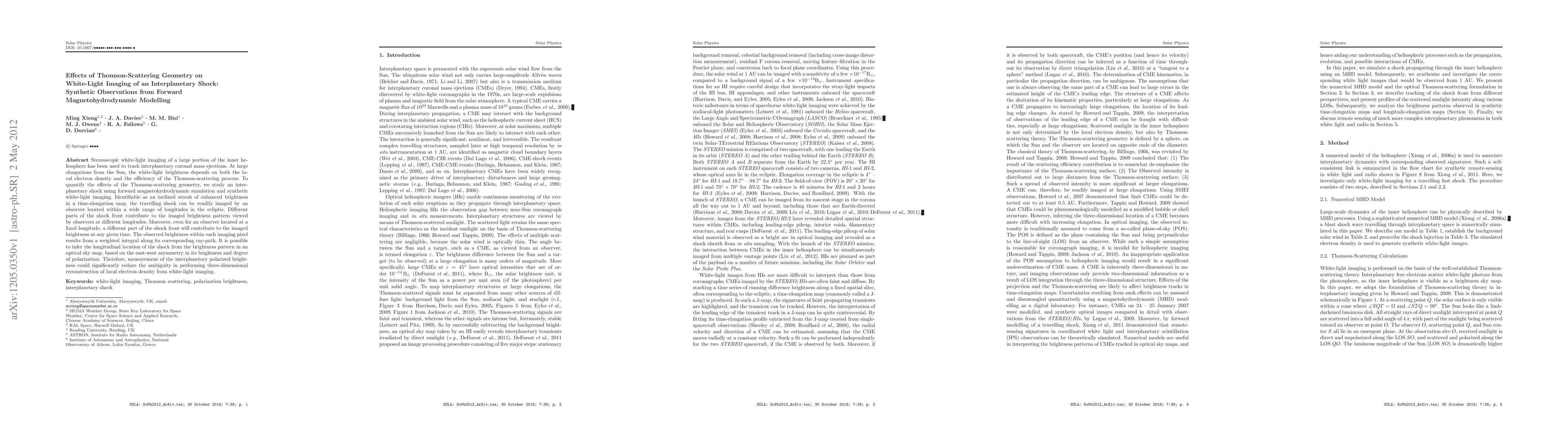 This paper investigates how Thomson-scattering geometry influences white-light imaging of interplanetary shocks using forward magnetohydrodynamic simulations. It finds that different parts of the shock front contribute to brightness at various longitudes, and polarized brightness measurements can help reduce ambiguity in reconstructing electron density from white-light images.