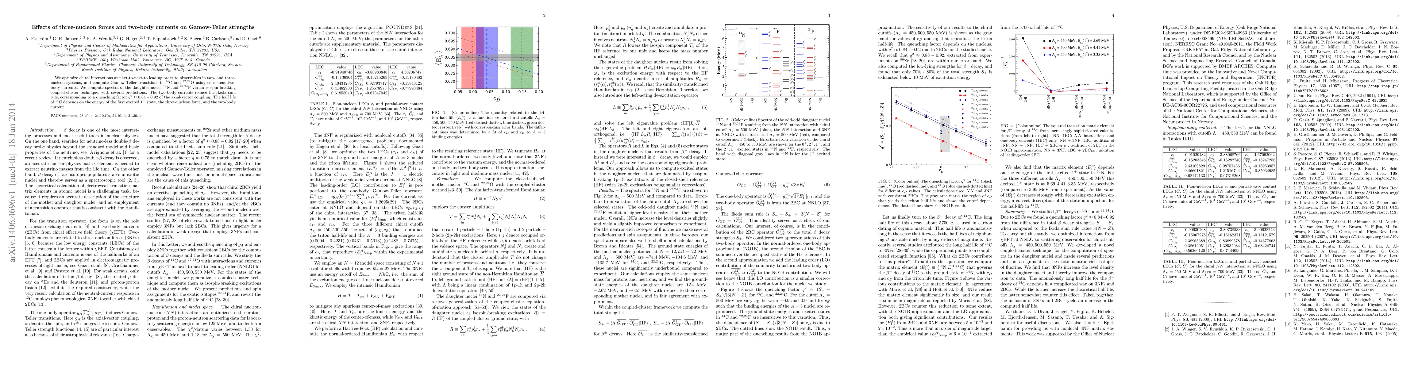 We optimize chiral interactions at next-to-next-to leading order to observables in two- and three-nucleon systems, and compute Gamow-Teller transitions in carbon-14, oxygen-22 and oxygen-24 using consistent two-body currents. We compute spectra of the daughter nuclei nitrogen-14, fluorine-22 and fluorine-24 via an isospin-breaking coupled-cluster technique, with several predictions. The two-body currents reduce the Ikeda sum rule, corresponding to a quenching factor q^2 ~ 0.84-0.92 of the axial-vector coupling. The half life of carbon-14 depends on the energy of the first excited 1+ state, the three-nucleon force, and the two-body current.