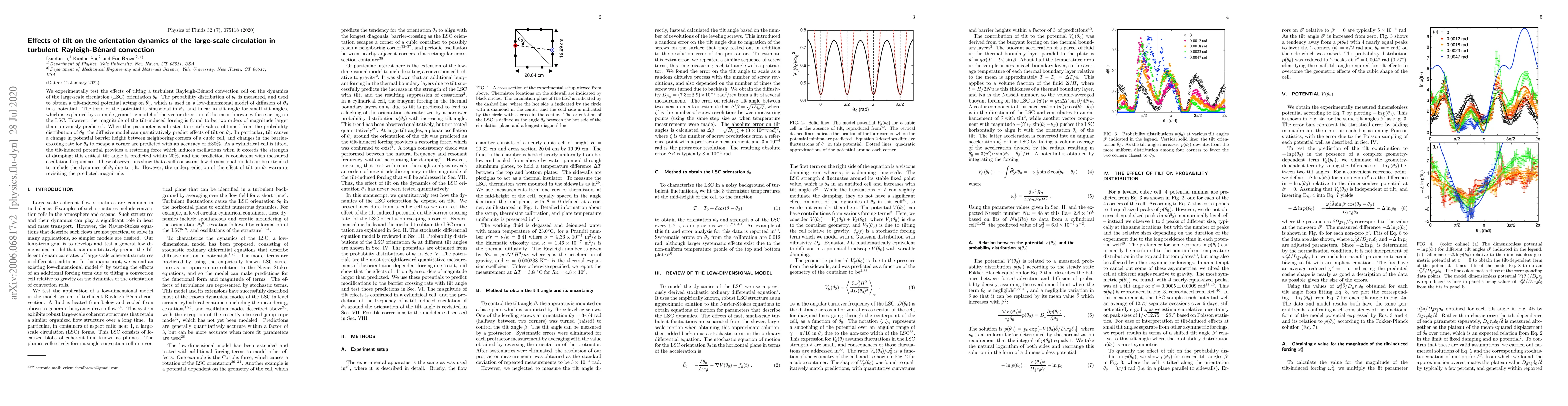 We experimentally test the effects of tilting a turbulent Rayleigh-B{\'e}nard convection cell on the dynamics of the large-scale circulation (LSC) orientation $\theta_0$. The probability distribution of $\theta_0$ is measured, and used to obtain a tilt-induced potential acting on $\theta_0$, which is used in a low-dimensional model of diffusion of $\theta_0$ in a potential. The form of the potential is sinusoidal in $\theta_0$, and linear in tilt angle for small tilt angles, which is explained by a simple geometric model of the vector direction of the mean buoyancy force acting on the LSC. However, the magnitude of the tilt-induced forcing is found to be two orders of magnitude larger than previously predicted. When this parameter is adjusted to match values obtained from the probability distribution of $\theta_0$, the diffusive model can quantitatively predict effects of tilt on $\theta_0$. In particular, tilt causes a change in potential barrier height between neighboring corners of a cubic cell, and changes in the barrier-crossing rate for $\theta_0$ to escape a corner are predicted with an accuracy of $\pm30\%$. As a cylindrical cell is tilted, the tilt-induced potential provides a restoring force which induces oscillations when it exceeds the strength of damping; this critical tilt angle is predicted within 20\%, and the prediction is consistent with measured oscillation frequencies. These observations show that a self-consistent low-dimensional model can be extended to include the dynamics of $\theta_0$ due to tilt. However, the underprediction of the effect of tilt on $\theta_0$ warrants revisiting the predicted magnitude.