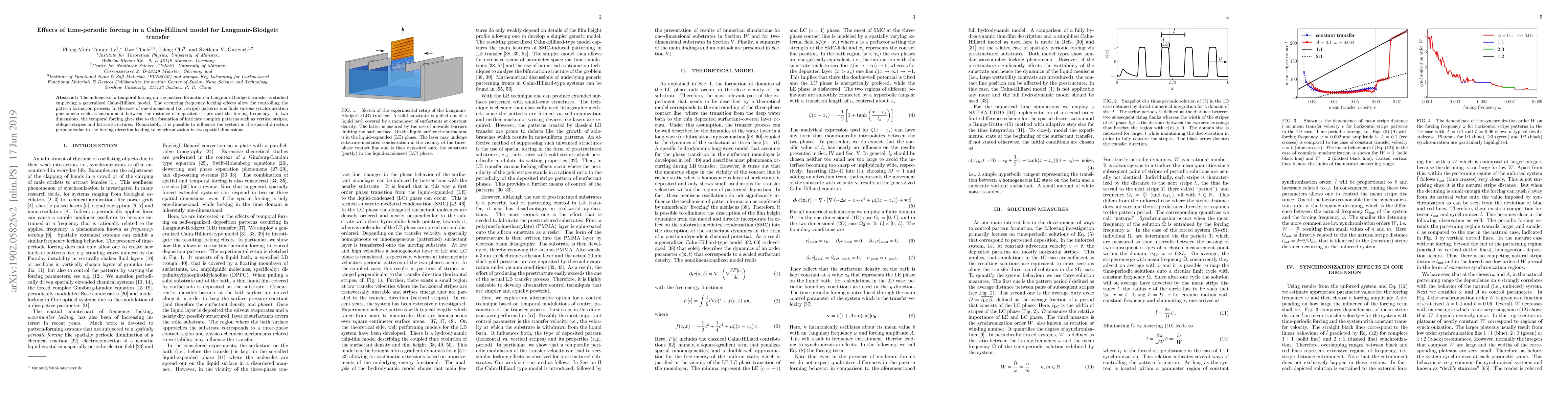 This study investigates how time-periodic forcing affects pattern formation in Langmuir-Blodgett transfer using a generalized Cahn-Hilliard model, revealing frequency locking effects that control pattern development. It finds synchronization phenomena in one-dimensional patterns and complex, multi-directional patterns in two dimensions.