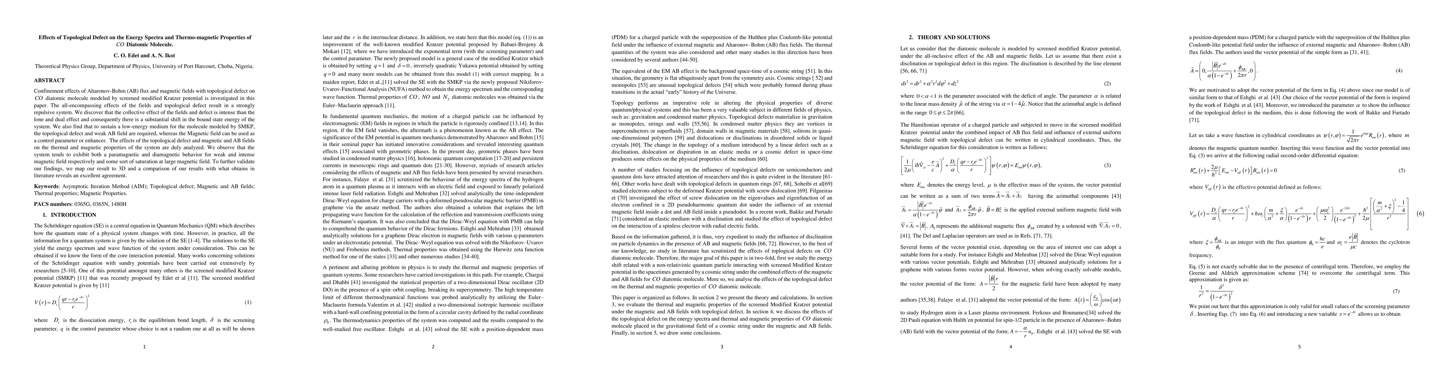 This paper investigates the impact of Aharonov-Bohm flux and magnetic fields with topological defects on the CO diatomic molecule using the screened modified Kratzer potential. The combined effects significantly alter the energy spectrum and thermo-magnetic properties, showing both paramagnetic and diamagnetic behaviors under varying magnetic fields.