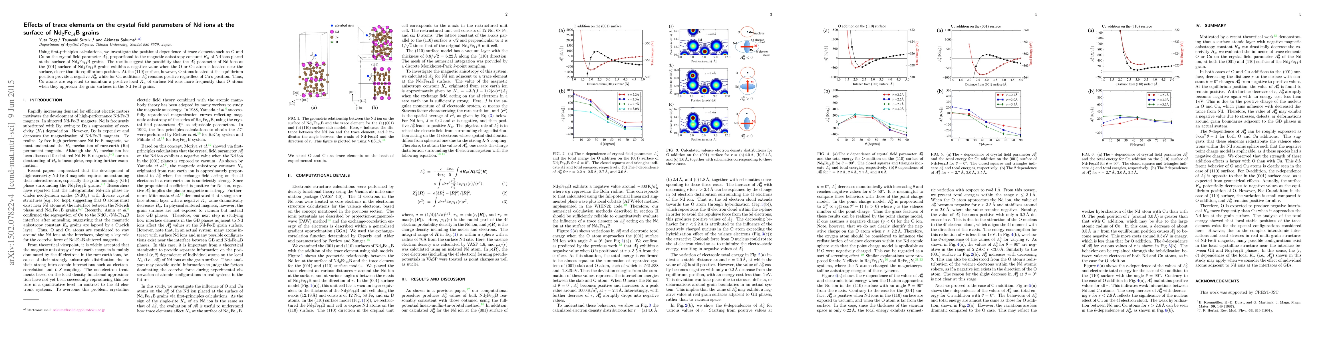 Using first-principles calculations, we investigate the positional dependence of trace elements such as O and Cu on the crystal field parameter $A_2^0$, proportional to the anisotropy constant $K_u$ of Nd ions placed at the surface of Nd$_2$Fe$_{14}$B grains. The results suggest the possibility that the $A_2^0$ parameter of Nd ions at the (001) surface of Nd$_2$Fe$_{14}$B grains exhibits a negative value when the O or Cu atom is located near the surface, closer than its equilibrium position. At the (110) surface, however, O atoms located at the equilibrium position provide a negative $A_2^0$, while for Cu additions $A_2^0$ remains positive regardless of Cu's position. Thus, Cu atoms are expected to maintain a positive local $K_u$ of surface Nd ions more frequently than O atoms when they approach the grain surfaces in the Nd-Fe-B grains.