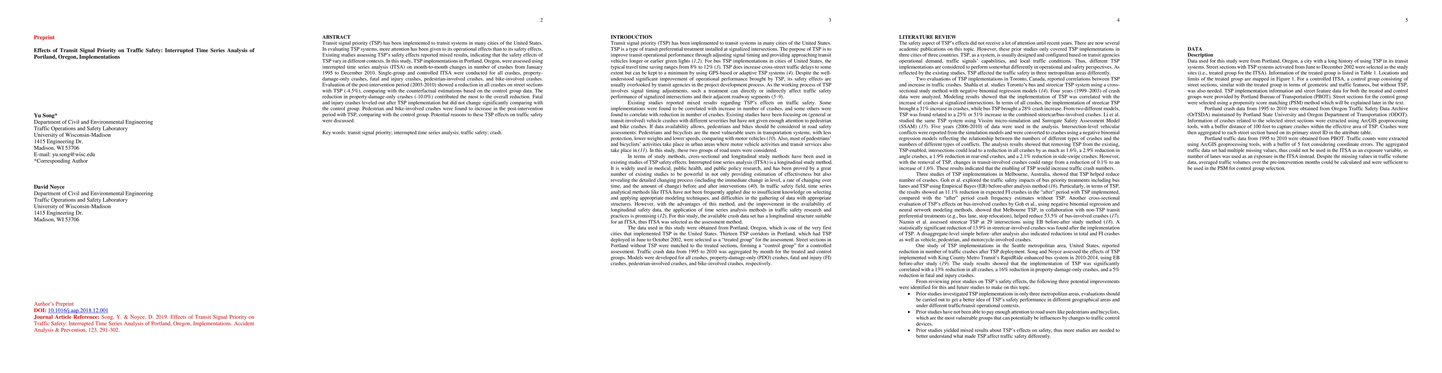 A study in Portland, Oregon found that transit signal priority (TSP) systems resulted in a 4.5% reduction in overall crashes, with the largest decrease seen in property-damage-only crashes, but an increase in pedestrian and bike-involved crashes.